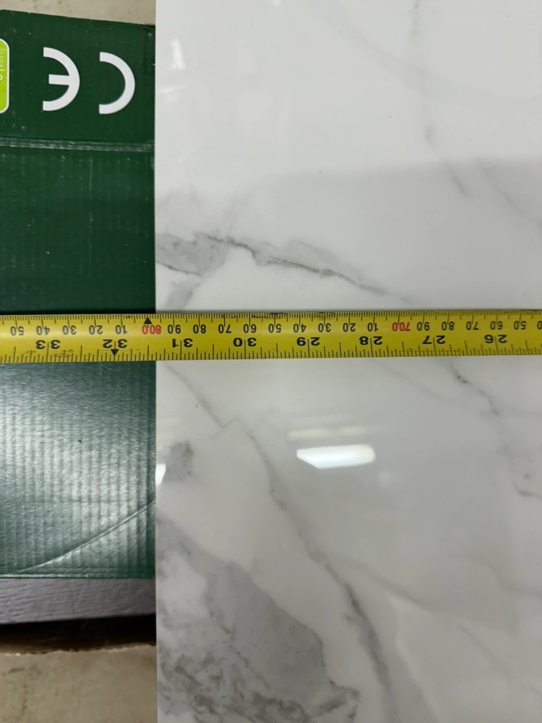 White marble style tile with grey veining. Measurements are 31.5 inches x 15 inches. A total of 16 tiles.