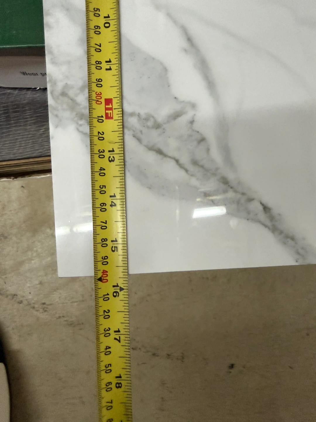 White marble style tile with grey veining. Measurements are 31.5 inches x 15 inches. A total of 16 tiles.