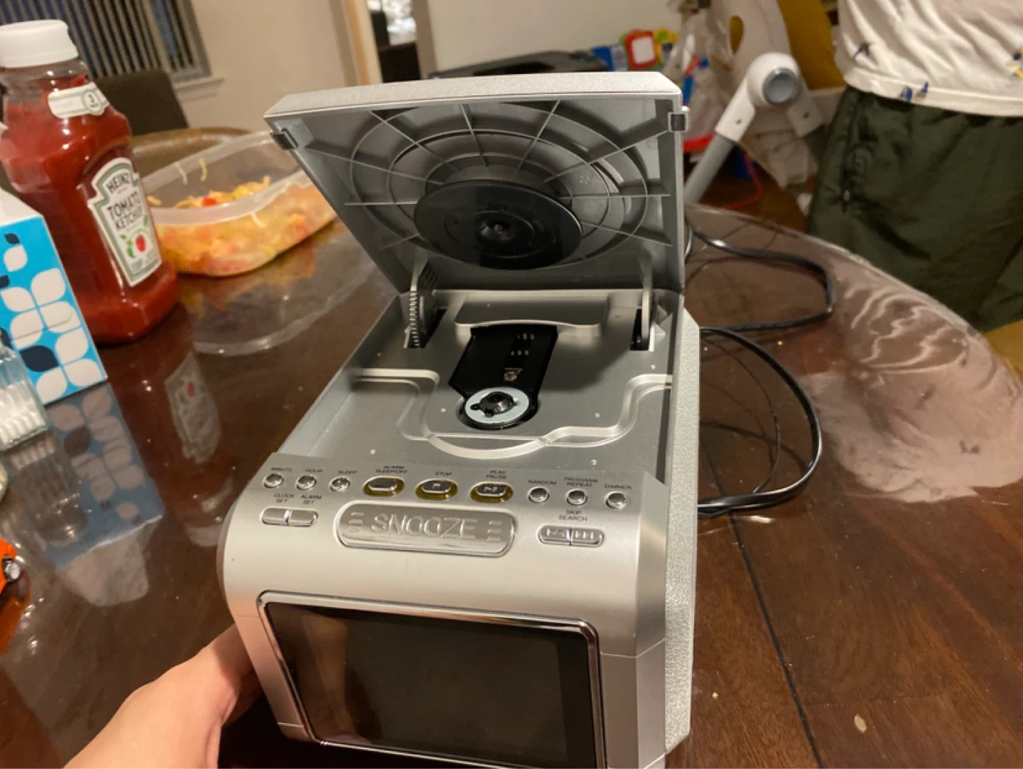 This Sylvania clock radio features an AM/FM tuner and a CD player. It has a large snooze button on top and a digital display. It includes a headphone jack.