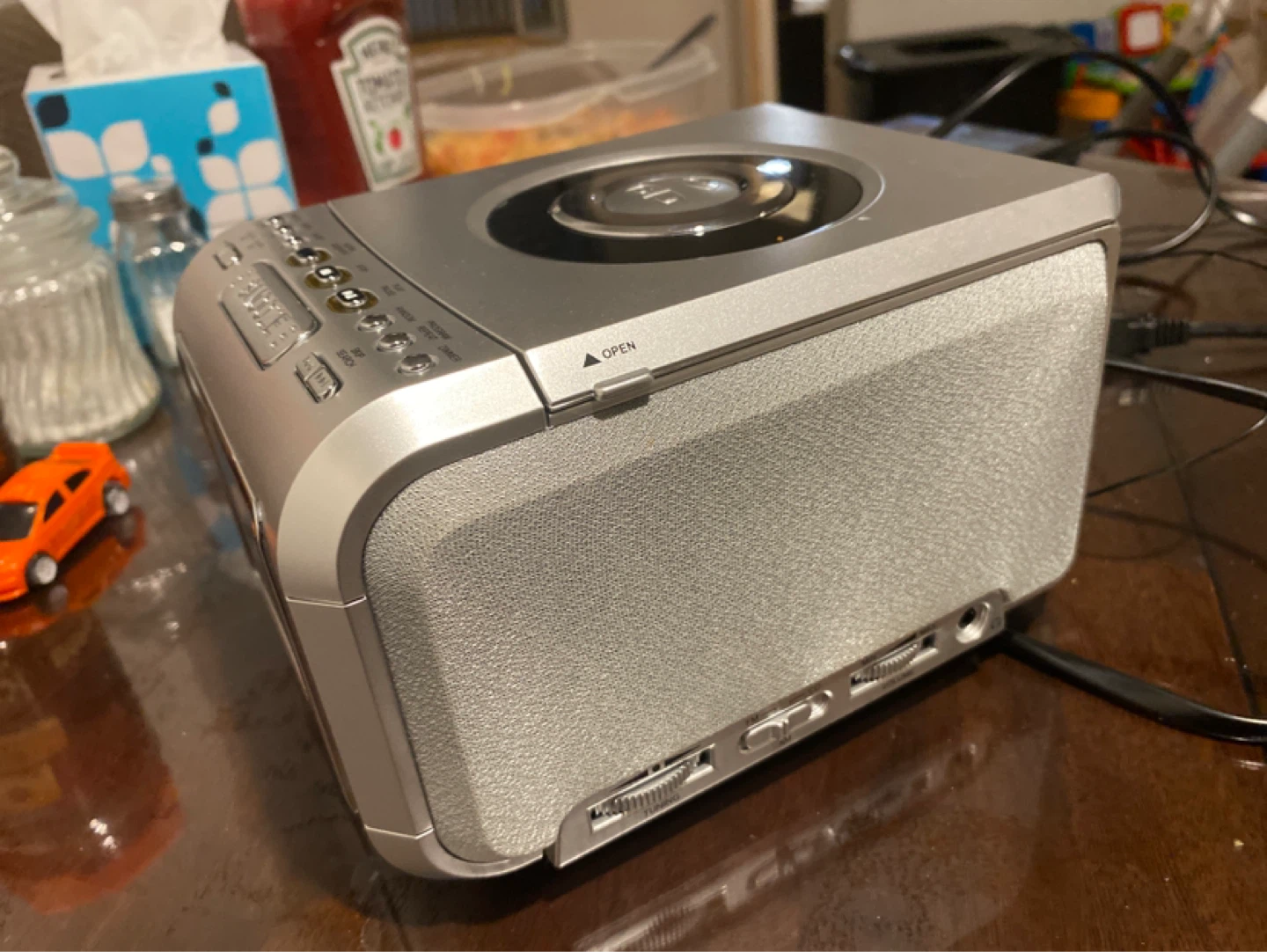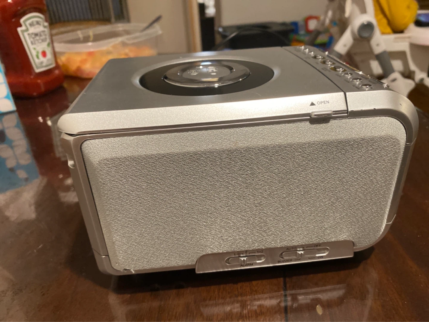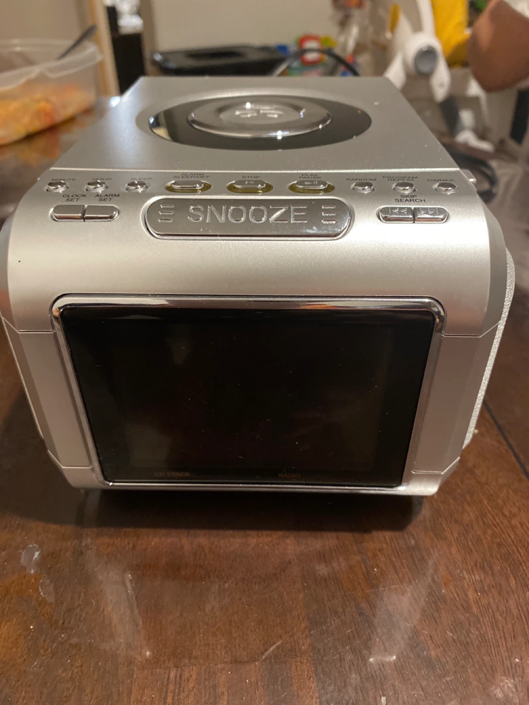 This Sylvania clock radio features an AM/FM tuner and a CD player. It has a large snooze button on top and a digital display. It includes a headphone jack.