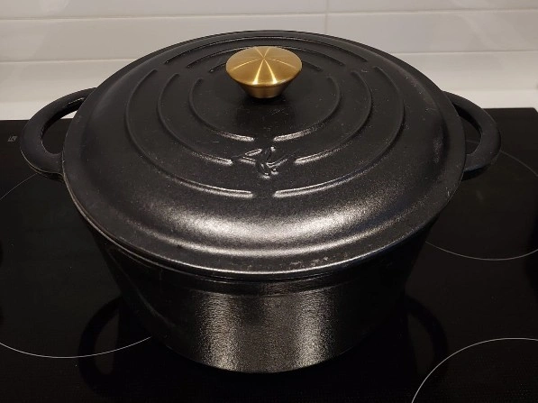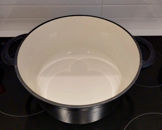 Enameled cast iron Dutch oven, 4.7 ltr capacity.