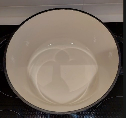 Enameled cast iron Dutch oven, 4.7 ltr capacity.