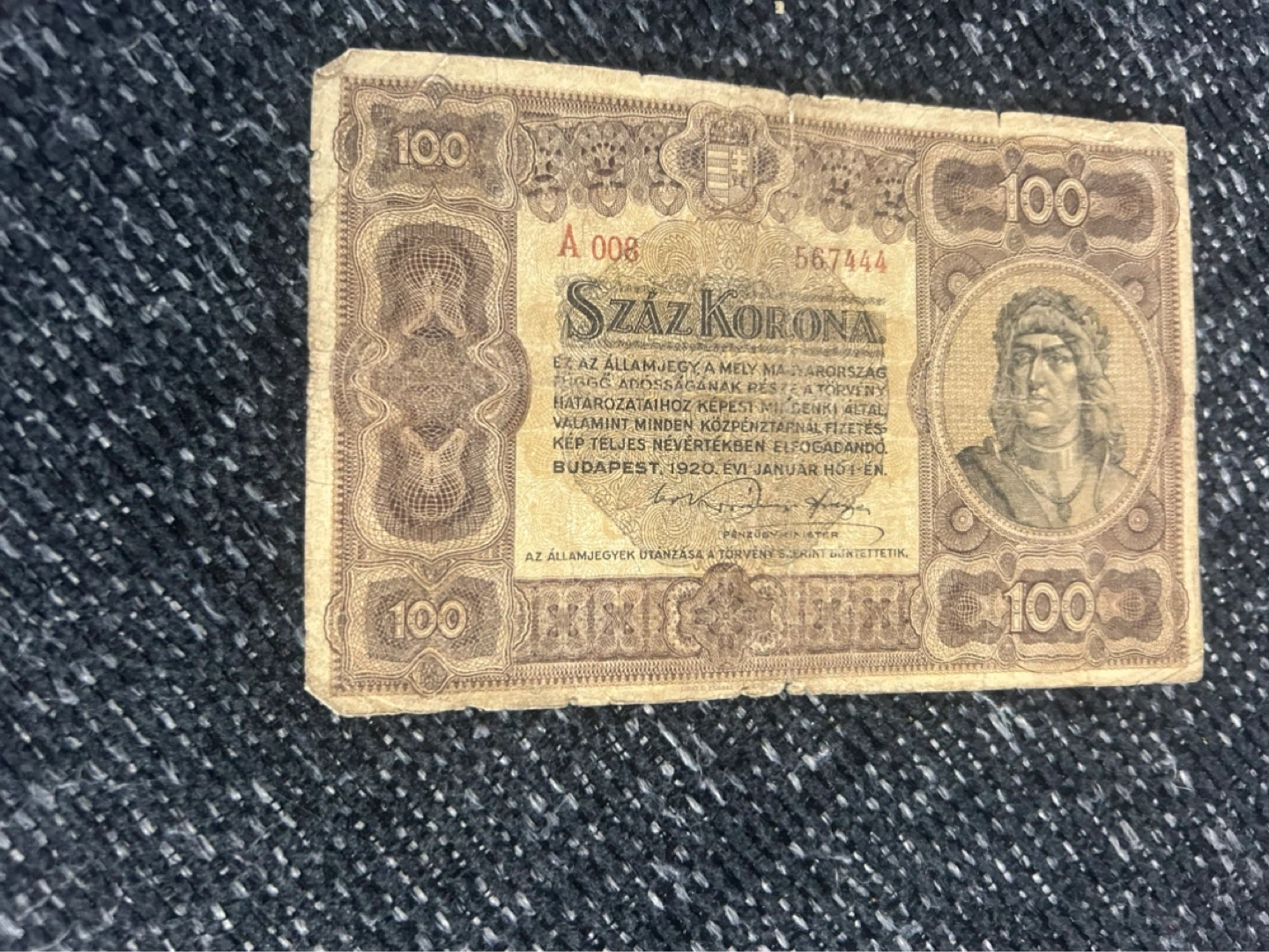 Hungarian 100 Korona banknote from 1920. This historical currency features a portrait and the text 'Száz Korona'. It was issued in Budapest in January 1920. This banknote would be a great addition for any collector of European currency.