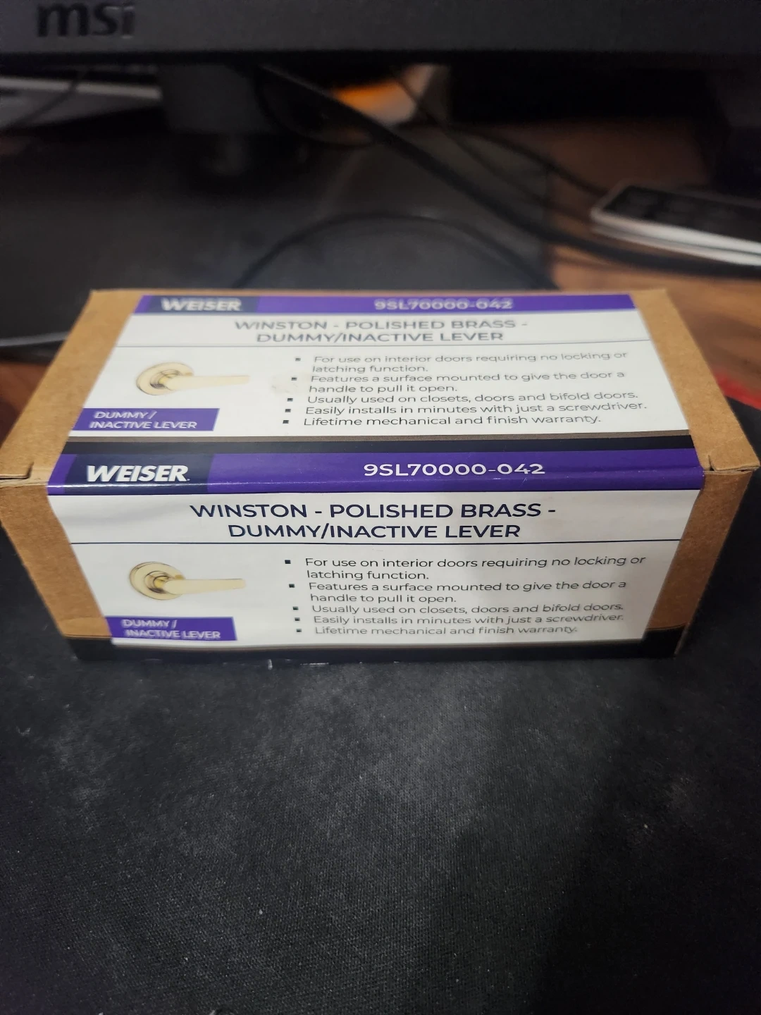 This is a new Weiser Winston dummy lever for interior doors. It's a polished brass finish and designed for doors requiring no locking or latching function. It easily installs in minutes with just a screwdriver.