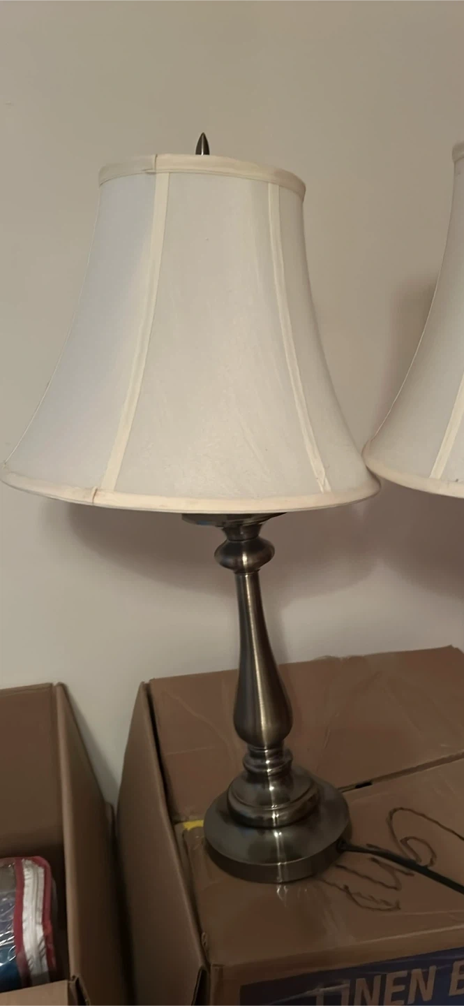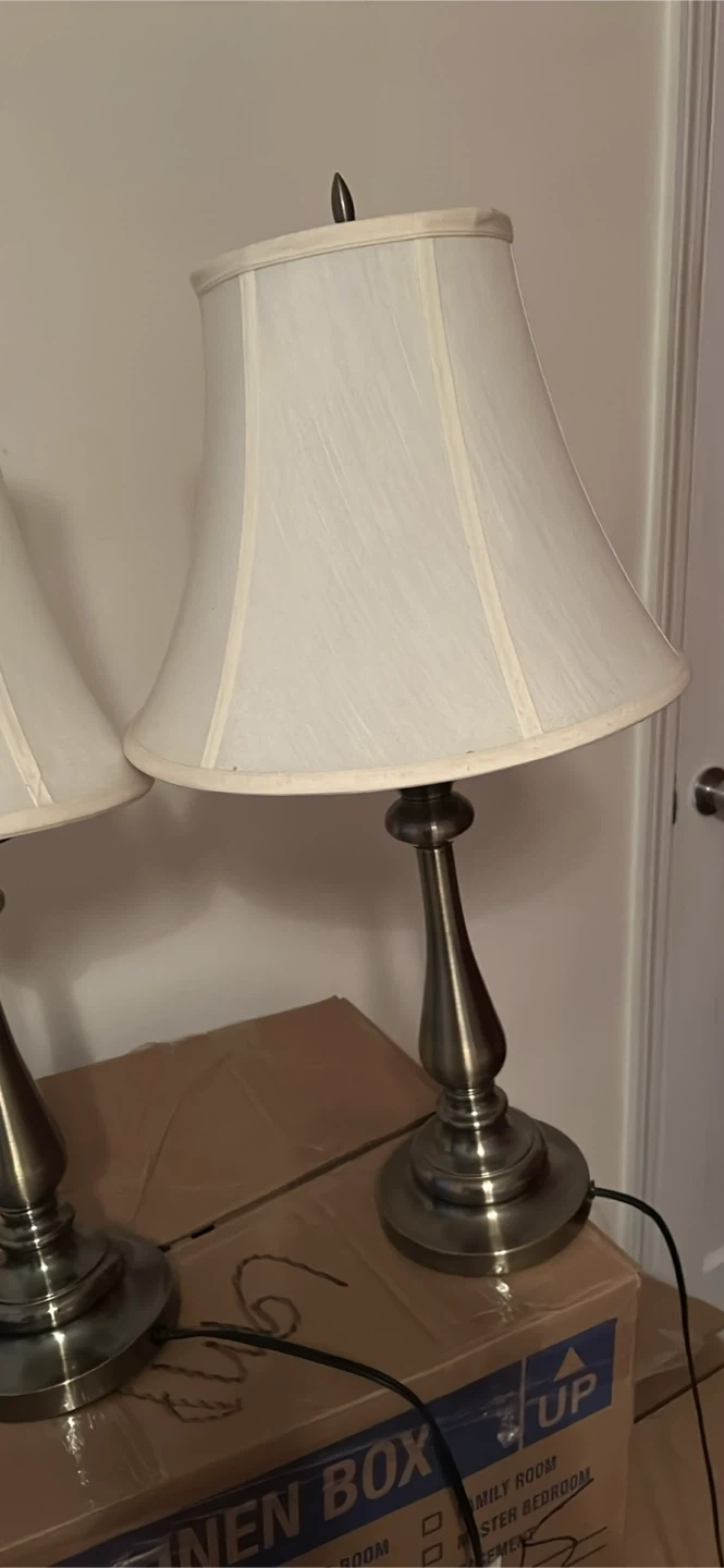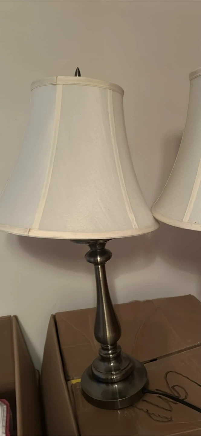 Selling a set of two table lamps! They come with classic white shades and a bronze-colored base. They're in great condition and ready to brighten up your space