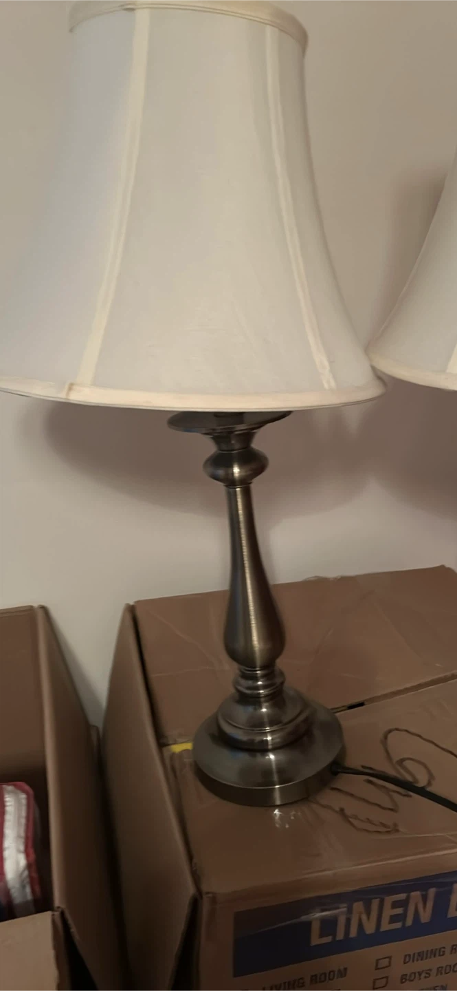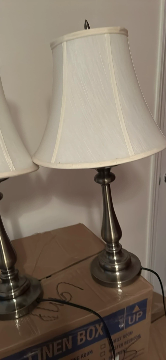 Selling a set of two table lamps! They come with classic white shades and a bronze-colored base. They're in great condition and ready to brighten up your space