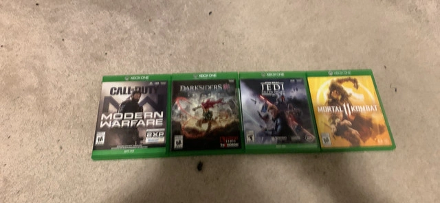 Bundle of 4 Xbox One games. Includes Call of Duty: Modern Warfare, Darksiders III, Star Wars Jedi: Fallen Order, and Mortal Kombat 11. Mortal Kombat 11 - $13 Star Wars Jedi: Fallen Order - $13 Darksiders III - $13 Call of Duty: Modern Warfare (2019 video game) - $23