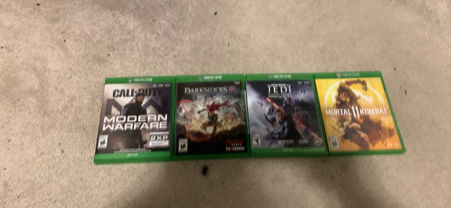 Bundle of 4 Xbox One games. Includes Call of Duty: Modern Warfare, Darksiders III, Star Wars Jedi: Fallen Order, and Mortal Kombat 11. Mortal Kombat 11 - $13 Star Wars Jedi: Fallen Order - $13 Darksiders III - $13 Call of Duty: Modern Warfare (2019 video game) - $23