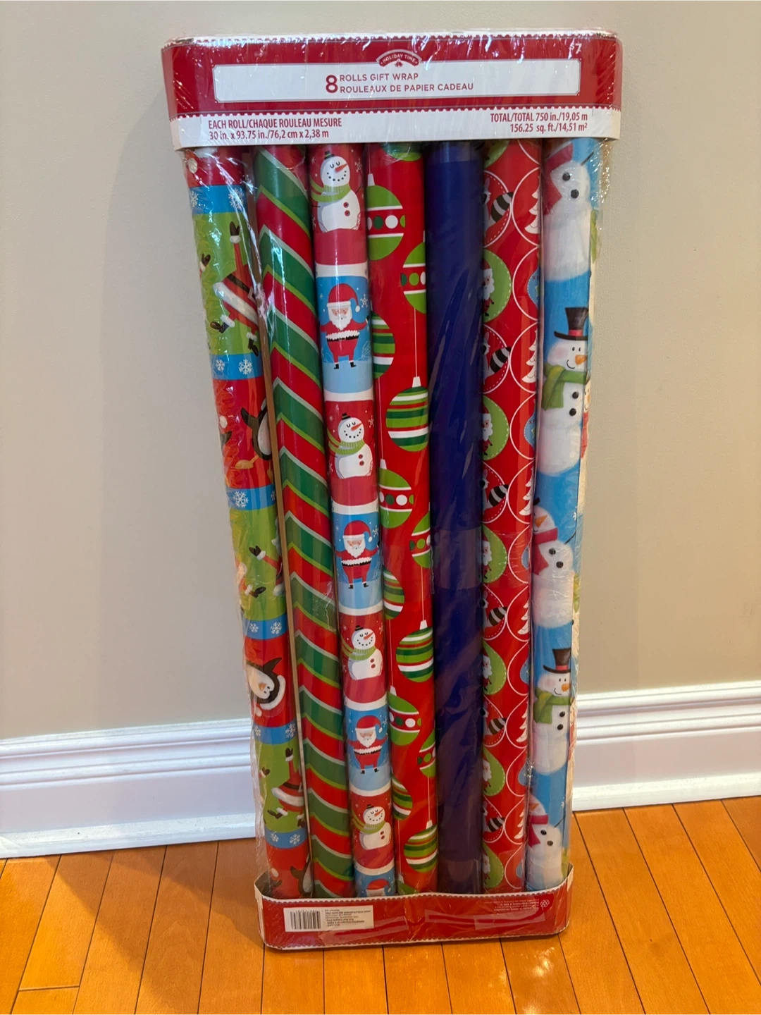 This package includes 8 rolls of holiday gift wrap. New and unopened. Each roll measures 30 in. x 93.75 in. The total is 750 sq. ft. of wrapping paper.