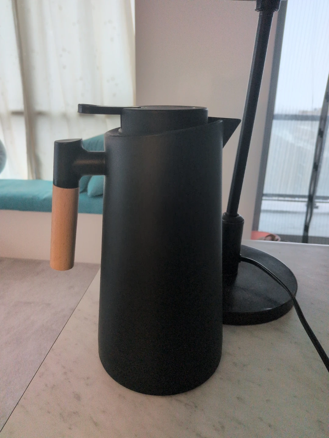 This black thermal carafe features a stylish wooden handle. It's designed to keep your beverages hot or cold. The pouring spout is easy to use.