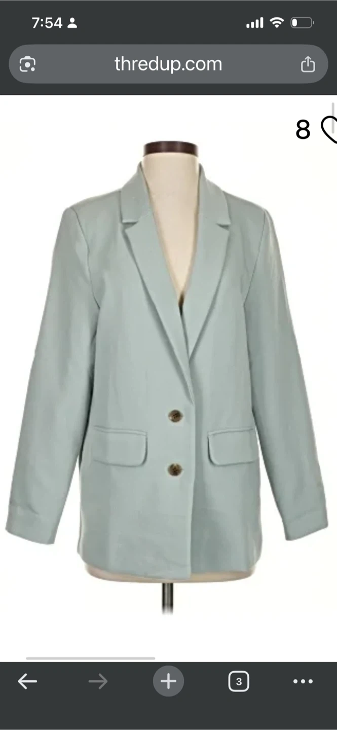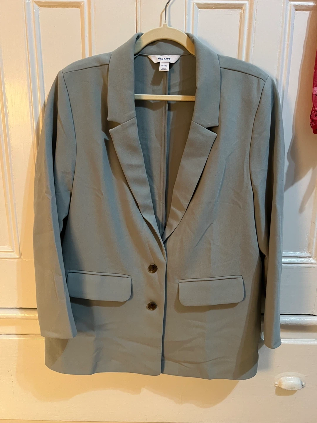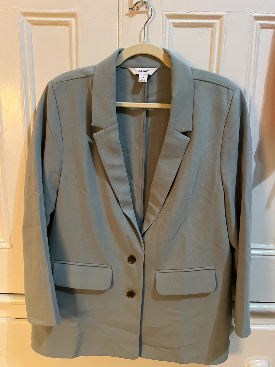 Light mint green Old Navy blazer. Size L Petite. A little wrinkled but just needs a good steaming and it’s good as new! Never worn before but no tags. Two-button closure.