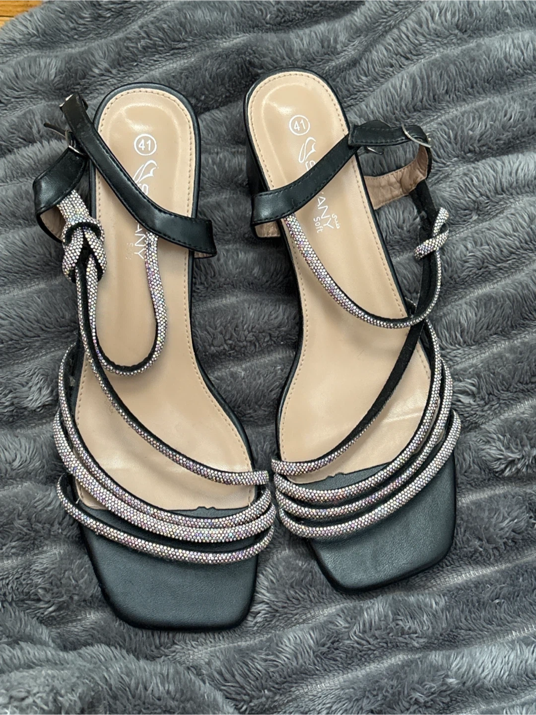 Selling a pair of Sefanit Sole black heeled sandals. They are a size 41 and feature delicate rhinestone detailing on the straps. Perfect for dressing up any outfit!