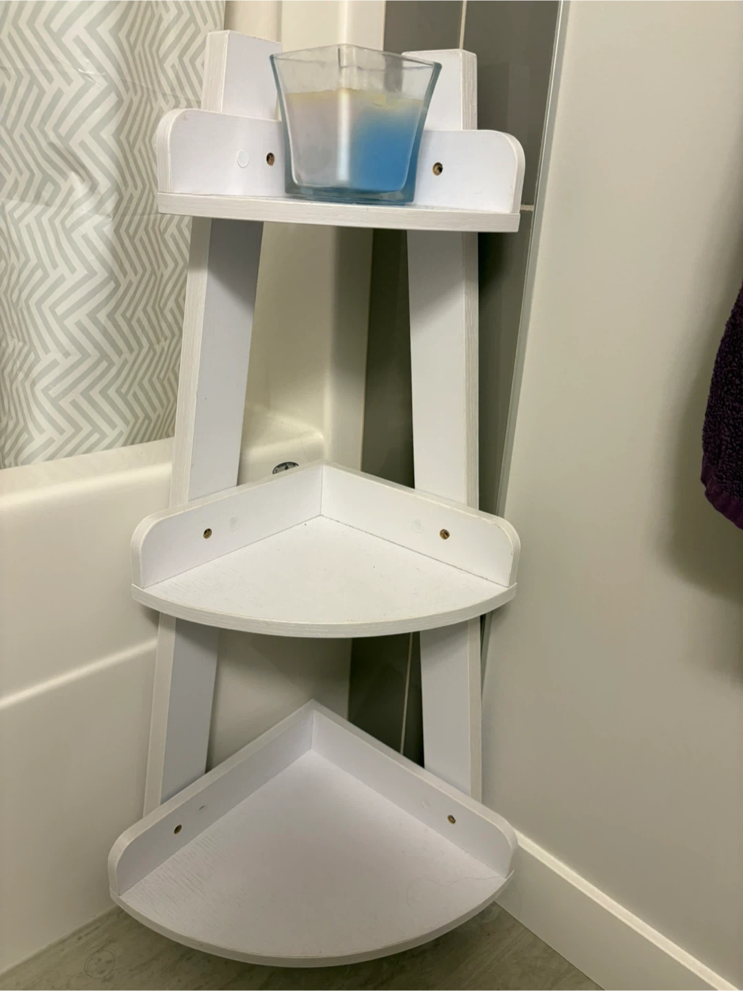 White 3-tier corner shelving unit. Perfect for organizing items in tight spaces like bathrooms or small rooms. It's made of wood and is a great way to add storage. This unit fits neatly into any corner!
