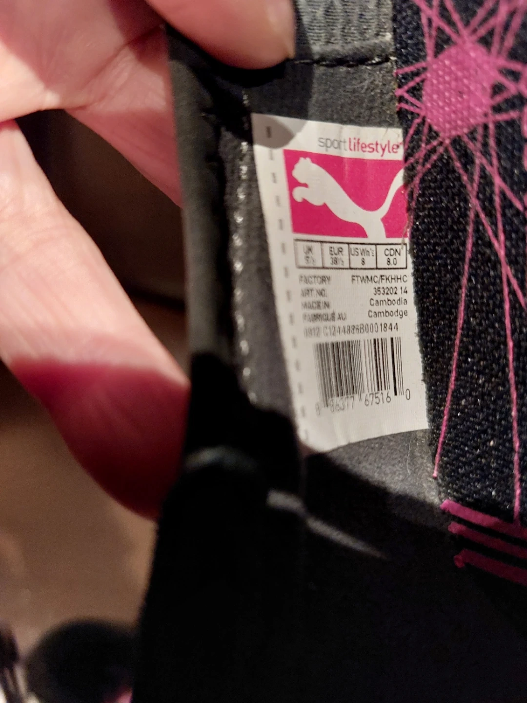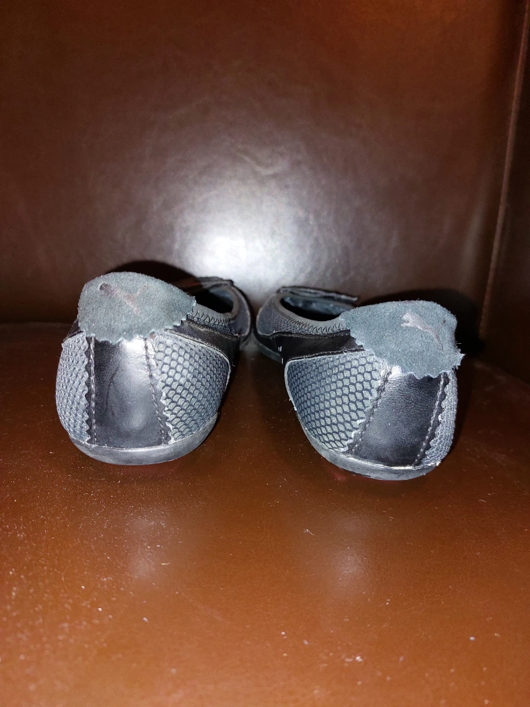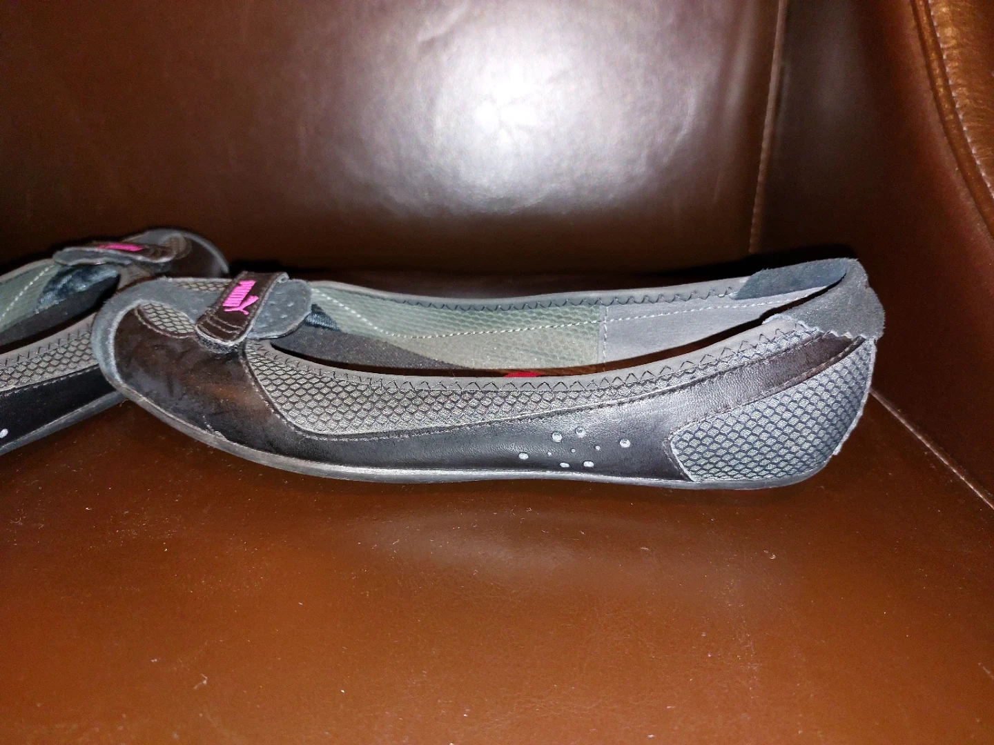 These Puma ballet flats are black with pink accents. They feature a mesh and real suede upper with a rubber sole. Comfortable and stylish for everyday wear! Size 8 women like new and memory foam sole very comfortable, just too big for me.