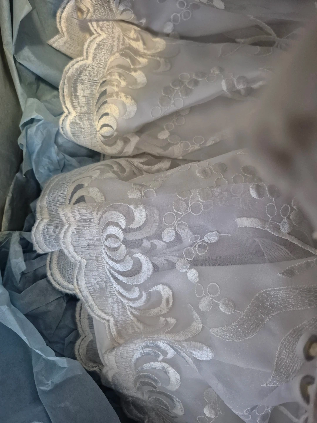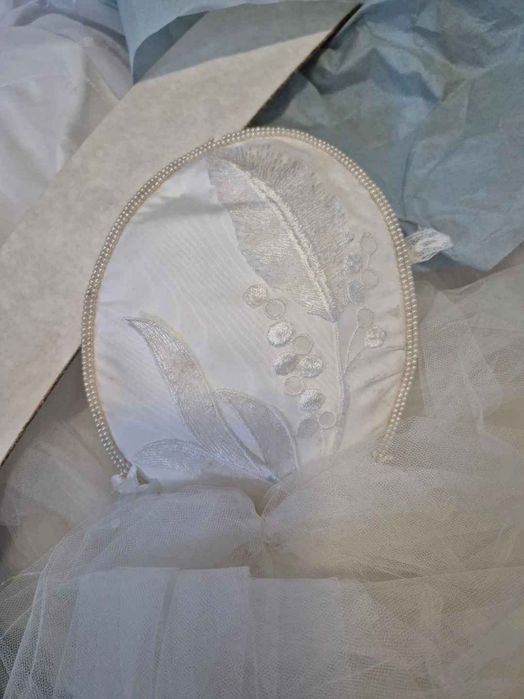 Dressmaker sewn. Taffeta and organza overlay. Sweetheart neckline. Stored in box and like new. Head piece and veil included. A photo of me wearing it is included to give an idea of the style. It was probably close to size 10 or 12.