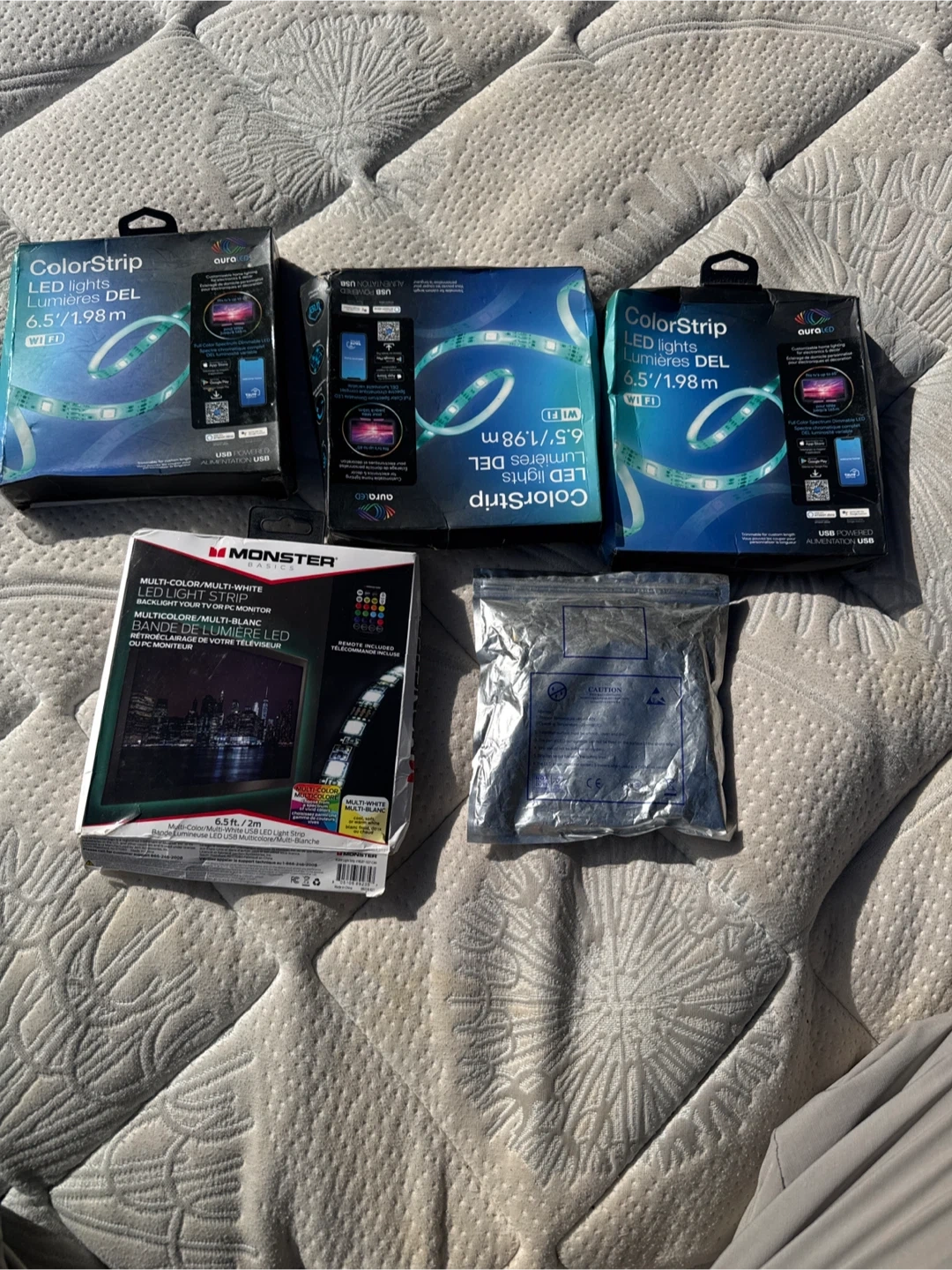 Includes three Aura LED ColorStrip light strips, each 6.5 ft. (1.98 m). Also includes one Monster Basics multi-color/multi-white LED light strip for TV or PC monitor backlight. All are USB powered.