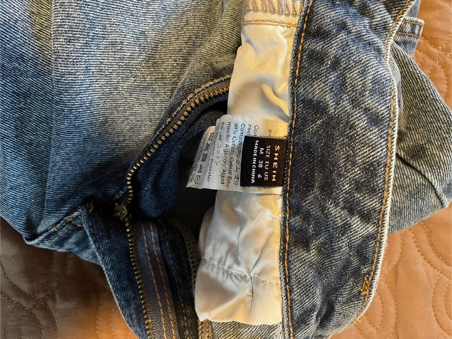 SHEIN light wash denim midi skirt with a zipper closure. This skirt is a size US 6, EU 36, and made in China. It's a classic style that's easy to wear.