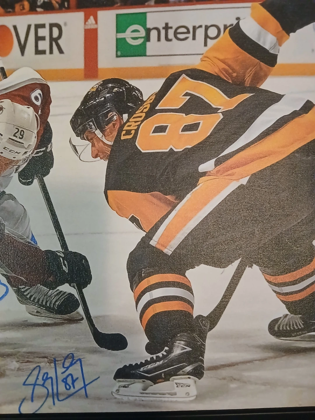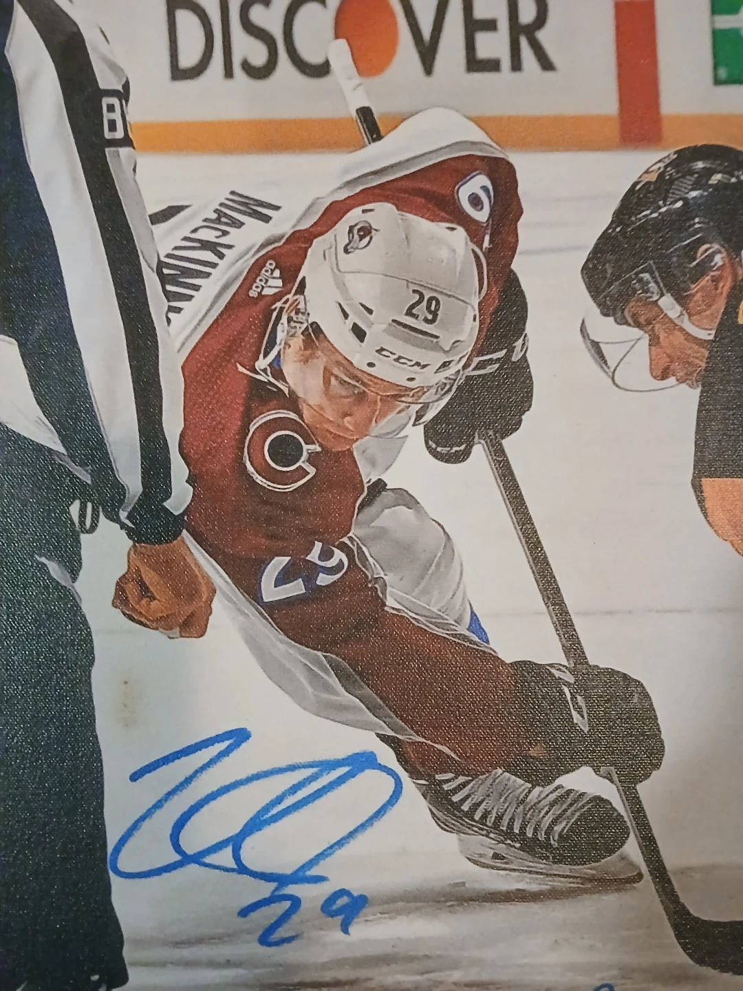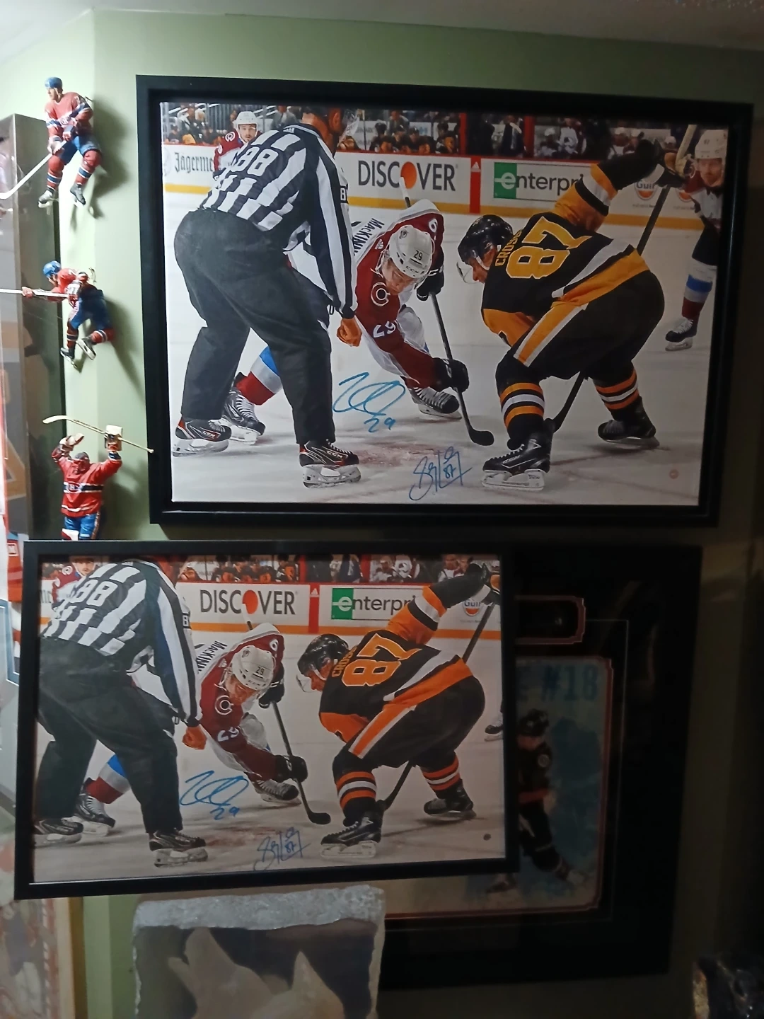 This is a framed canvas print of an NHL hockey face-off, featuring players Nathan MacKinnon and Sidney Crosby. It has been signed by both players in the original and then duplicated to the canvas print . Great for any hockey fan's collection! Reason for selling was able to obtain the original no need for both.