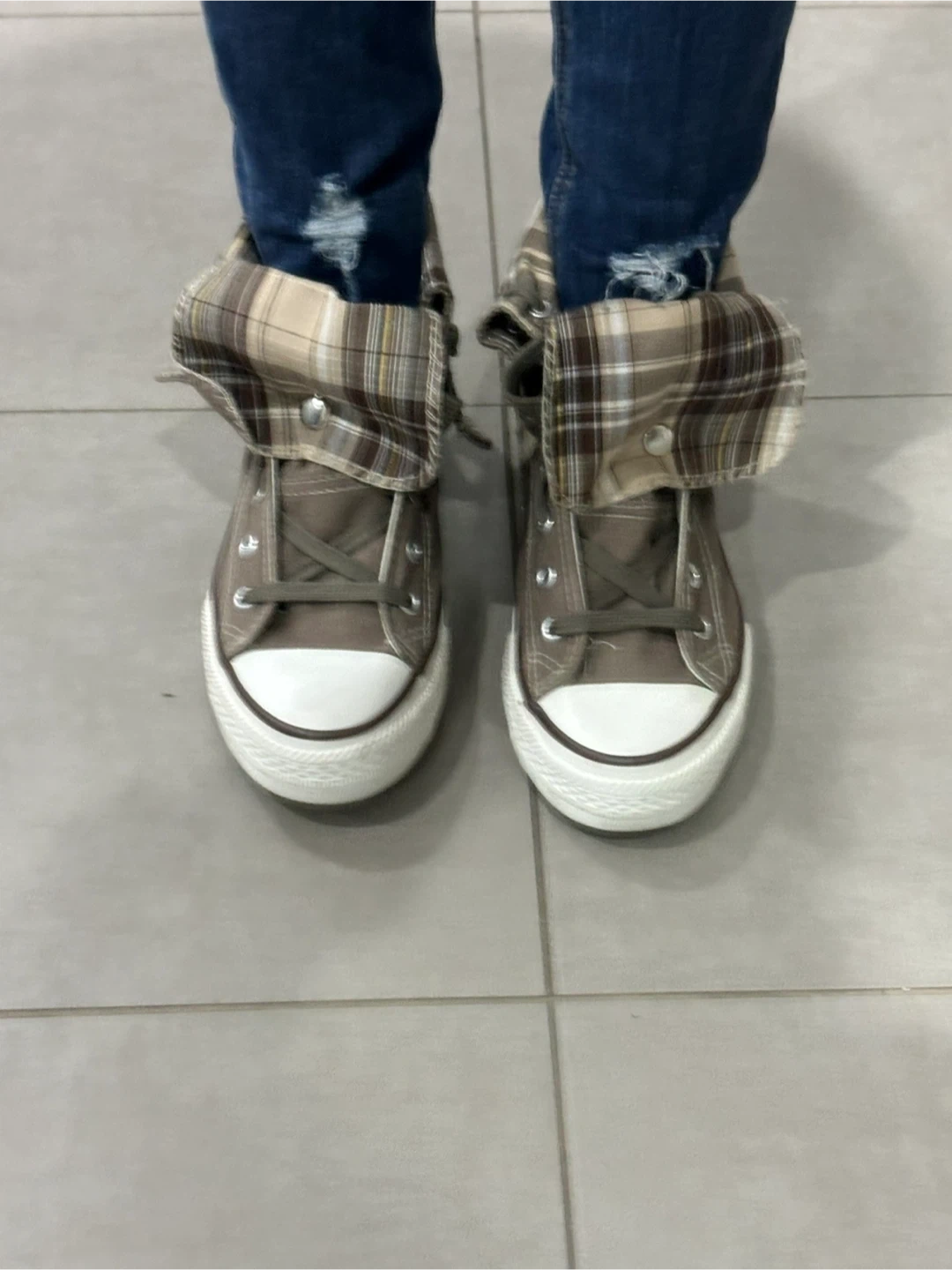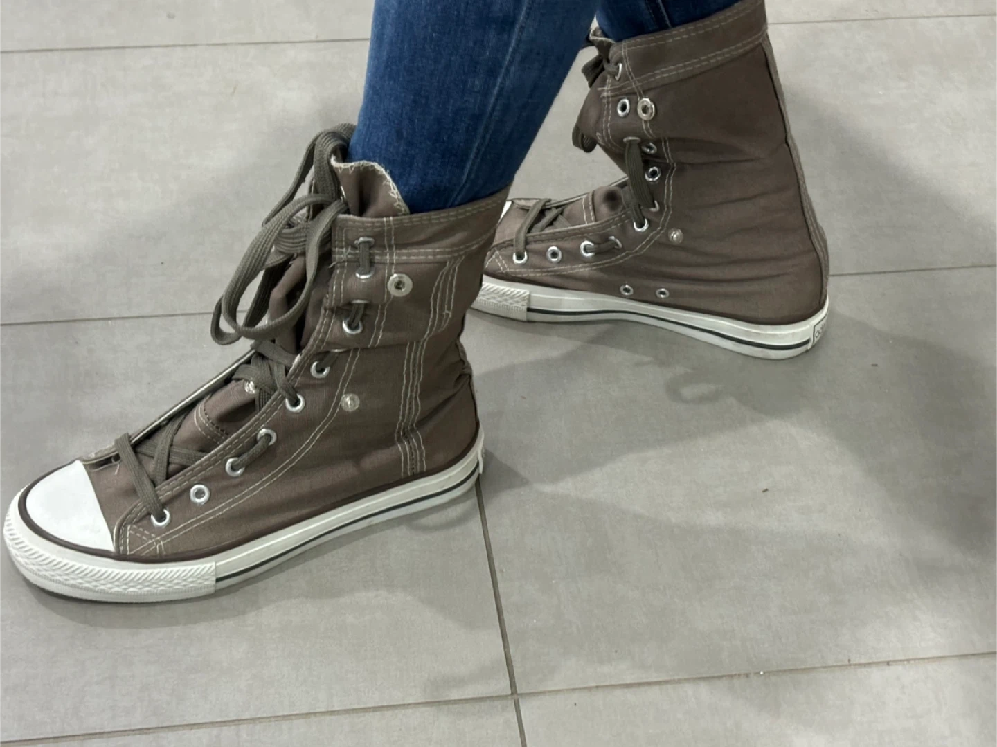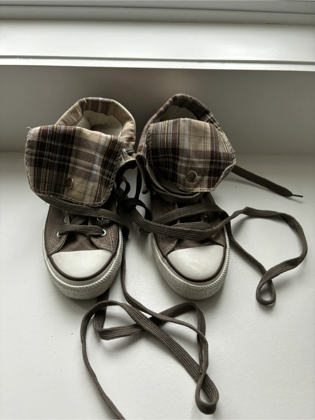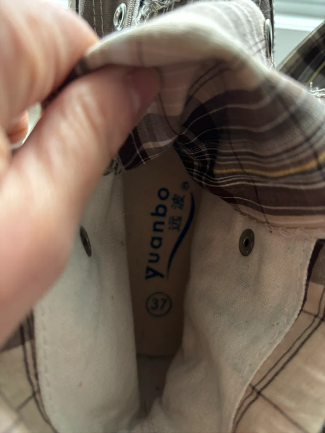 Cute Yuanbo canvas high-top sneakers in a neutral colour! They can be worn laced up or folded down for a different look. Size 37