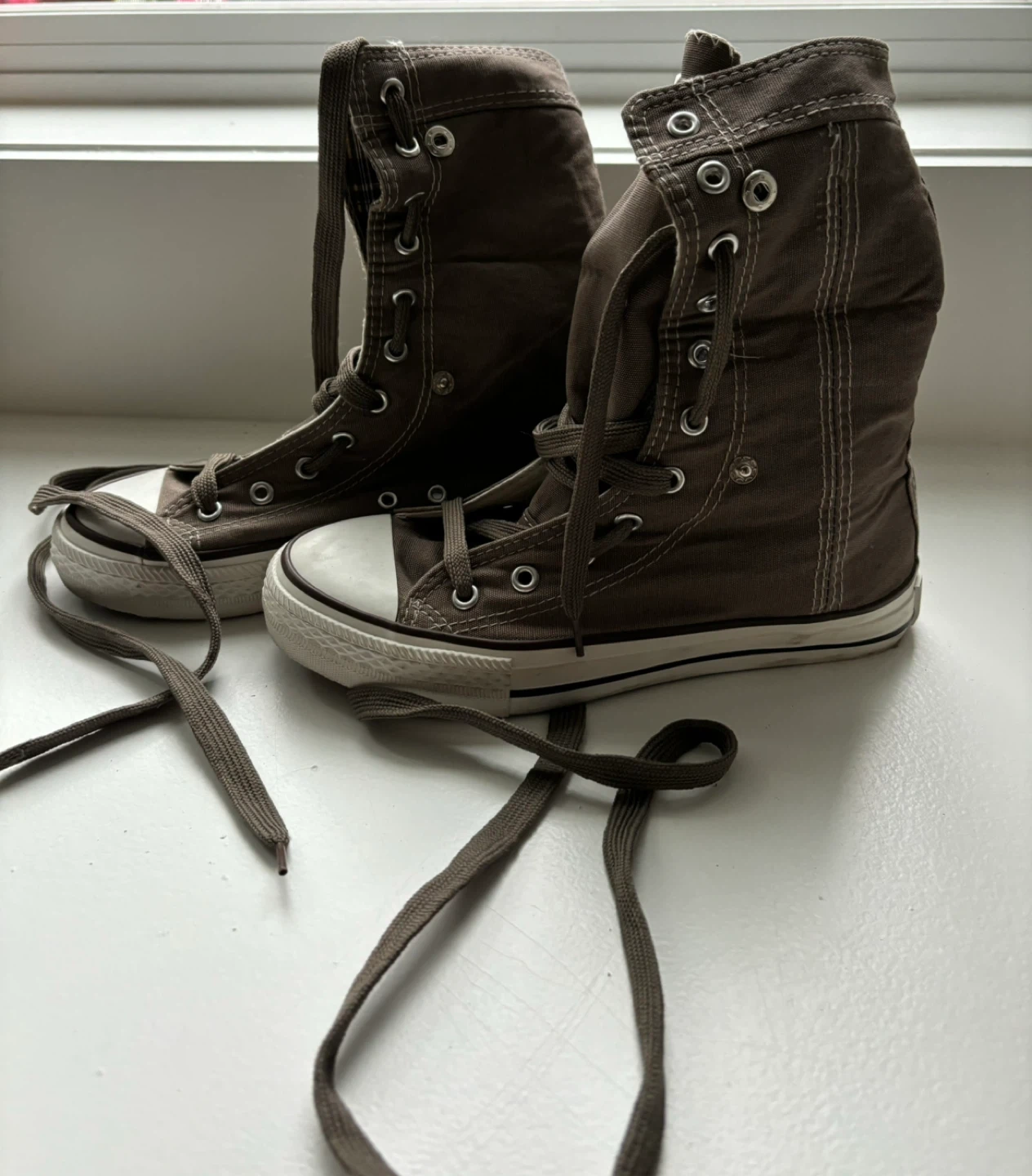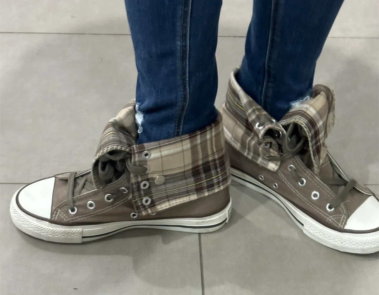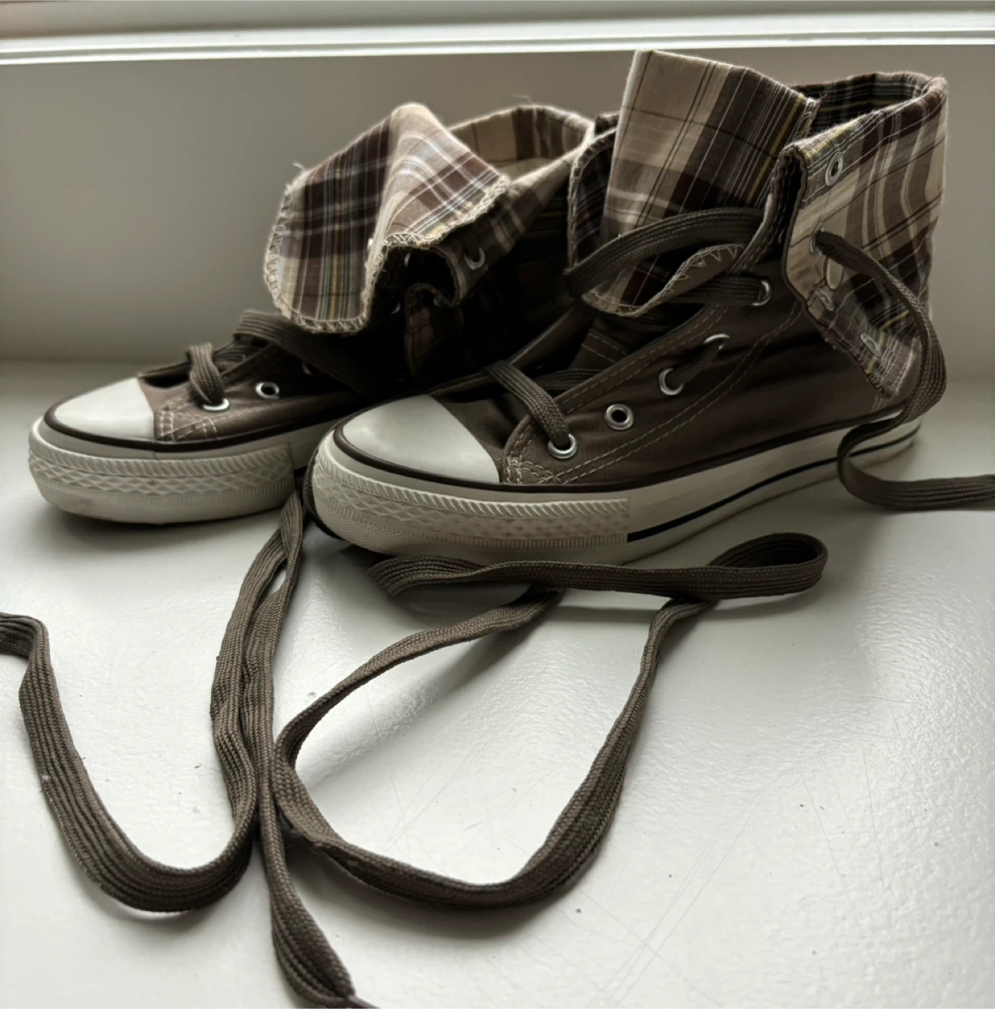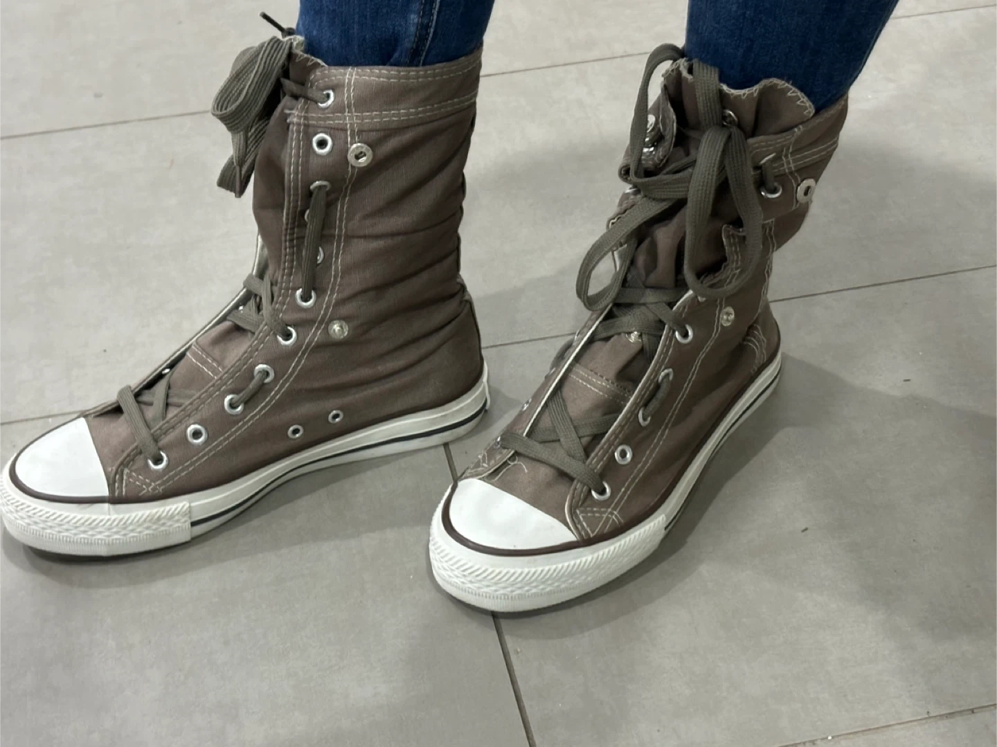Cute Yuanbo canvas high-top sneakers in a neutral colour! They can be worn laced up or folded down for a different look. Size 37