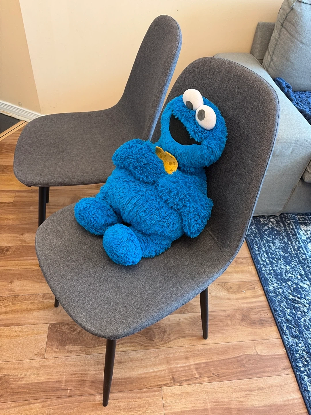 Selling a set of two grey dining chairs! They're in great condition and would look great in any dining room or kitchen. The chairs have a sleek, modern design with dark legs and a comfortable upholstered seat.