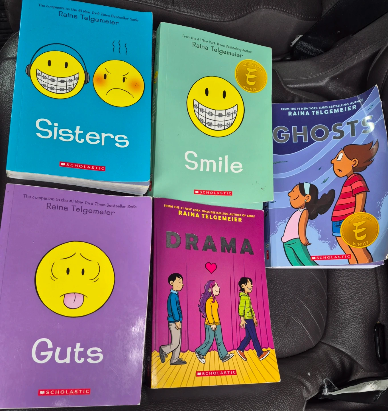 'Smile', 'Drama', 'Guts', 'Sisters', 'Ghosts', and 'The Baby-Sitters Club: Claudia and Mean Janine'. Great reads for young adults!