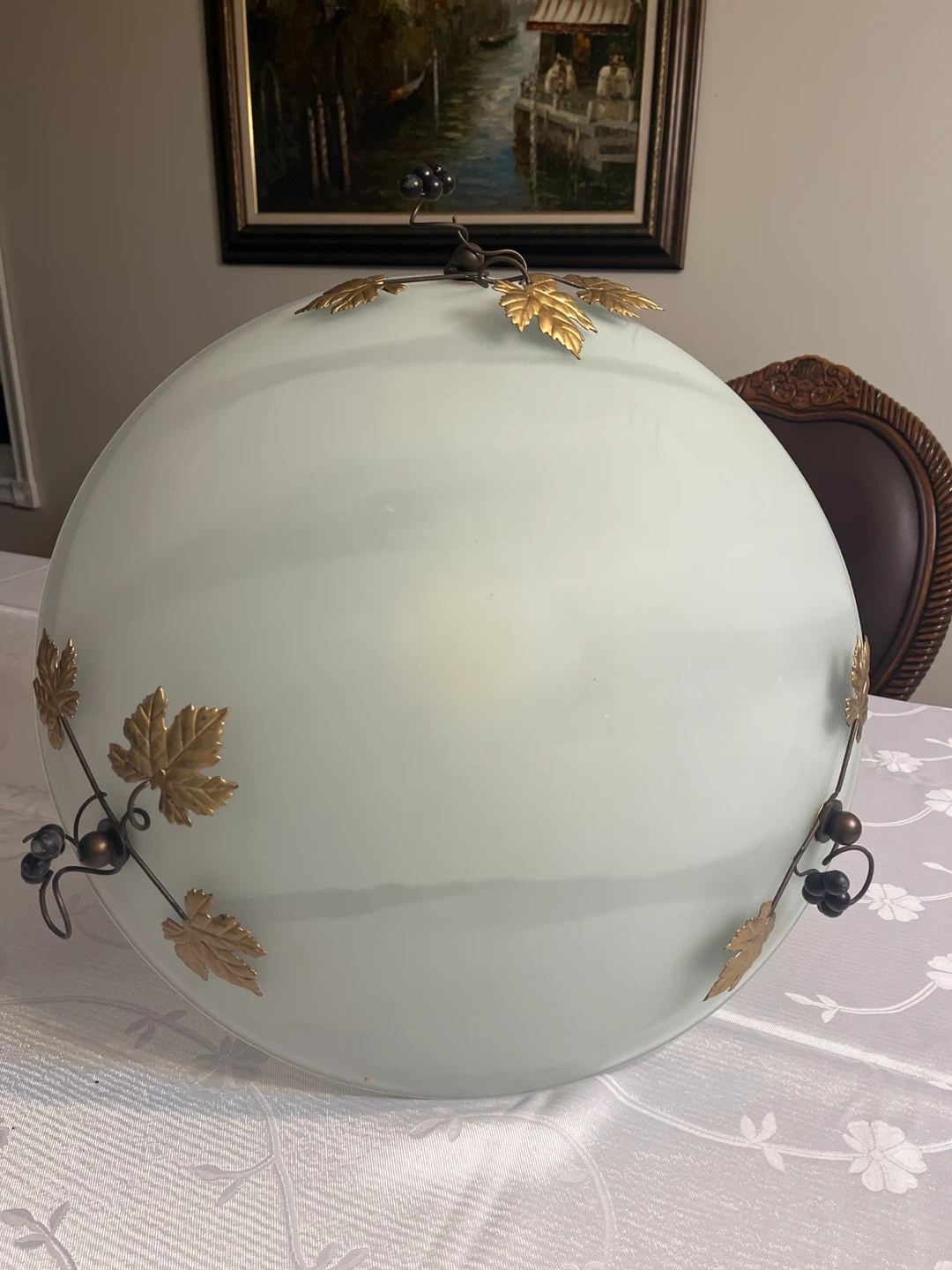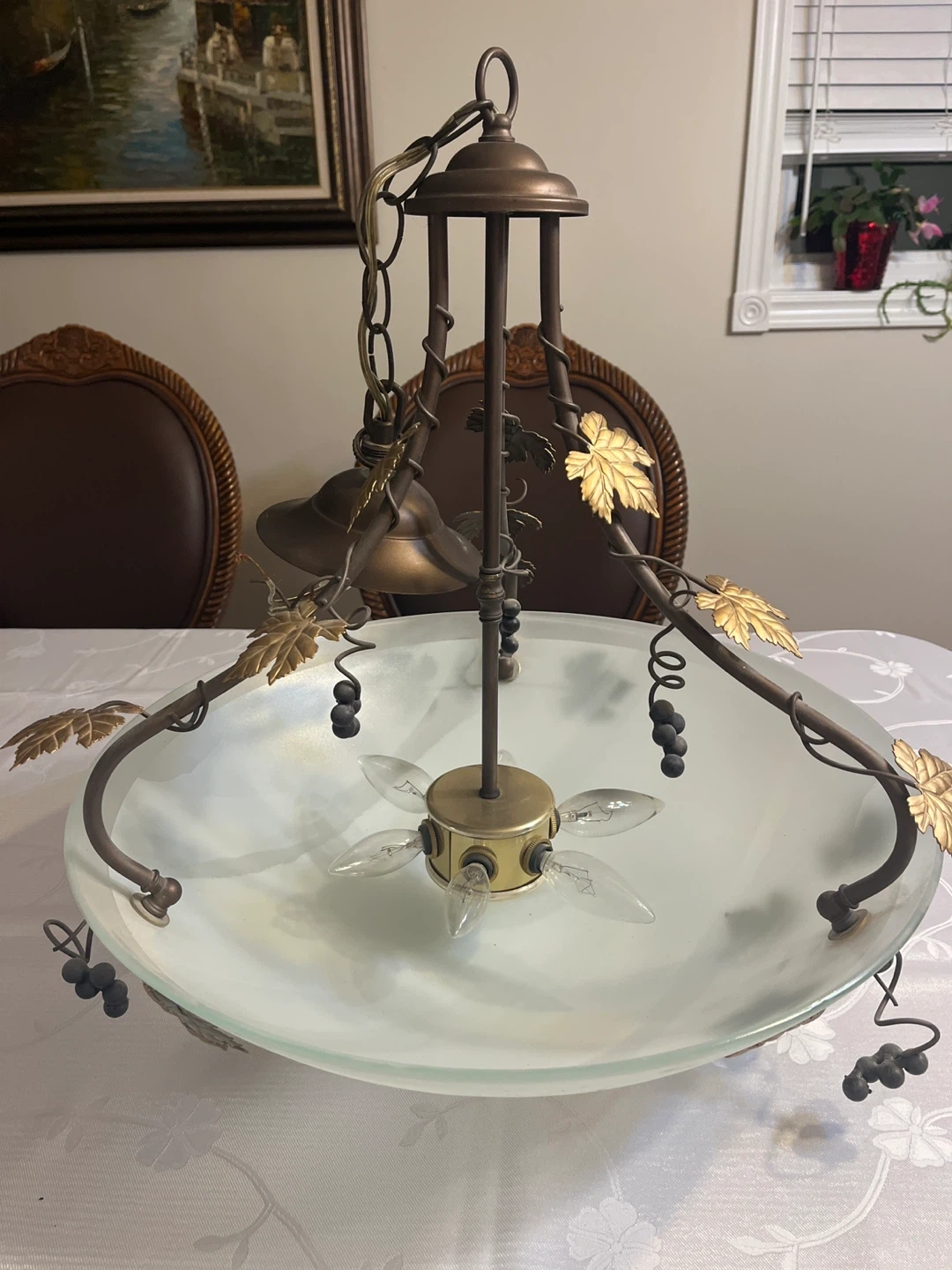 Selling a lovely chandelier with a vine and leaf design. It features a frosted glass shade and decorative metal vines with gold-coloured leaves and dark grape accents. It would add a touch of elegance to any room