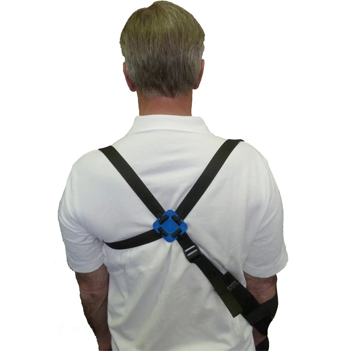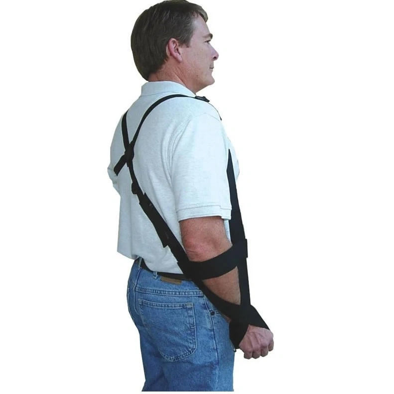 Reduces shoulder subluxation and pain by elevating the humerus and holding it in near neutral rotation.