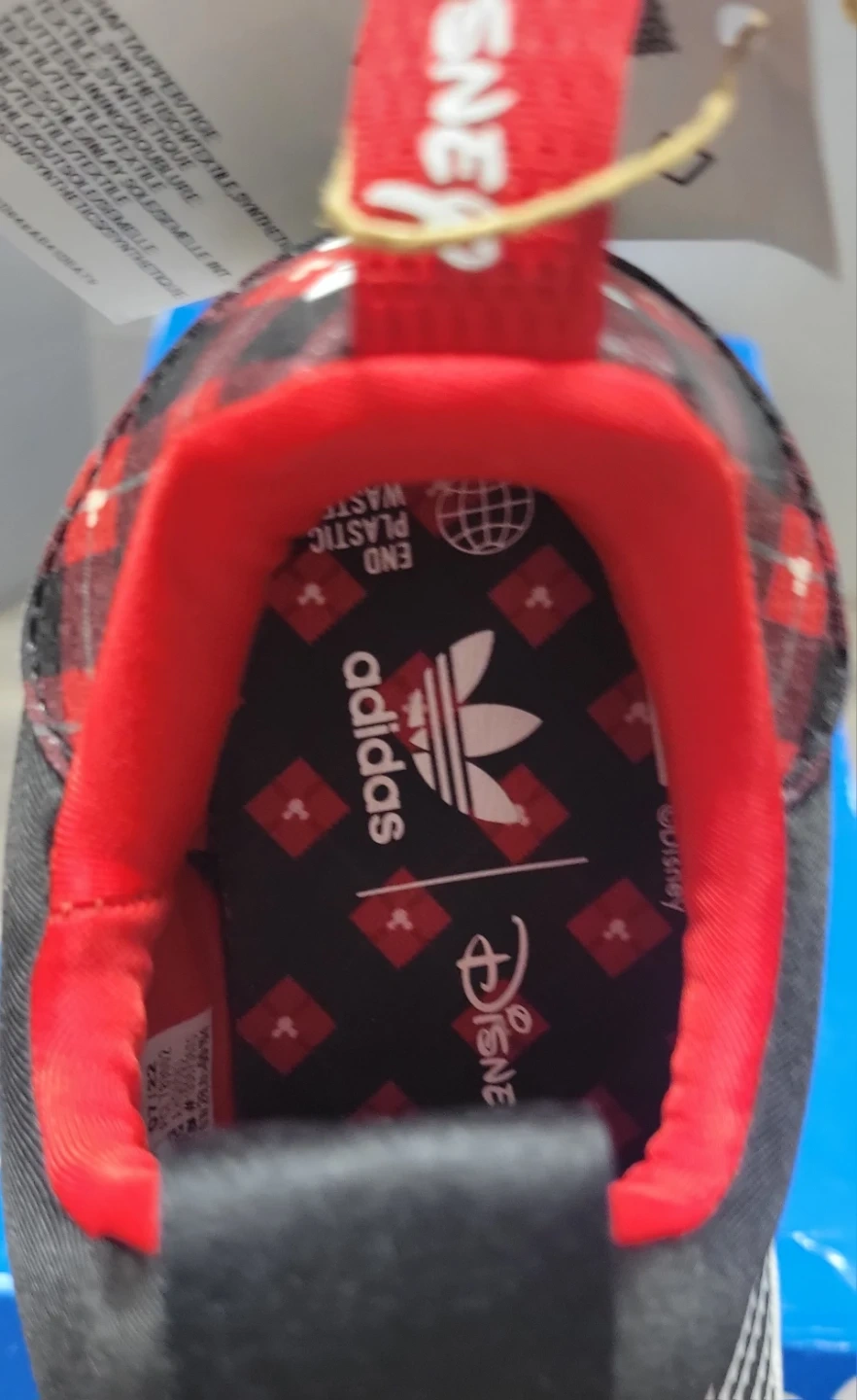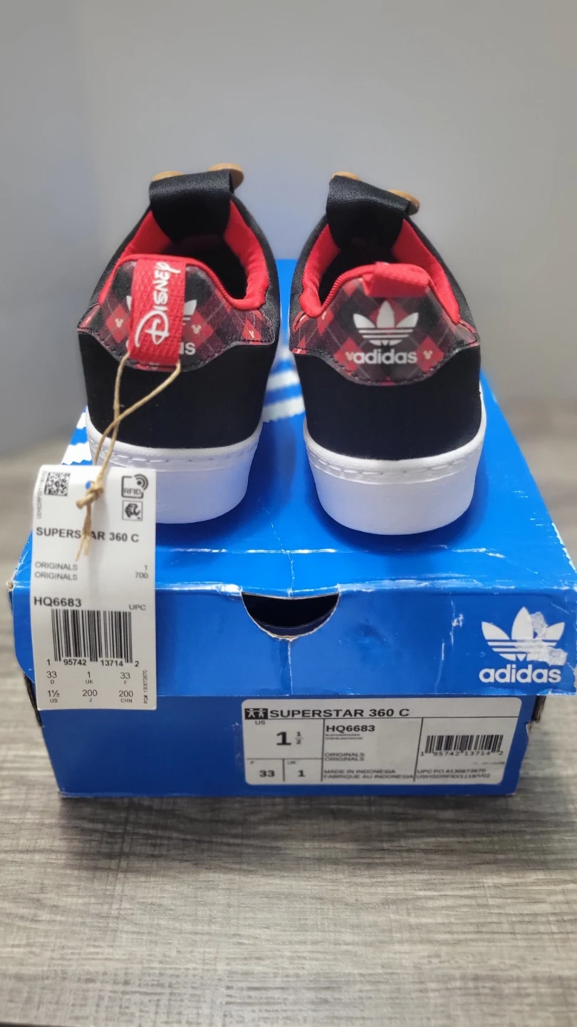 These are Adidas Superstar 360 C slip-on sneakers featuring a Mickey Mouse design. They're black with white accents and red plaid lining. Includes original box. Size 1.5