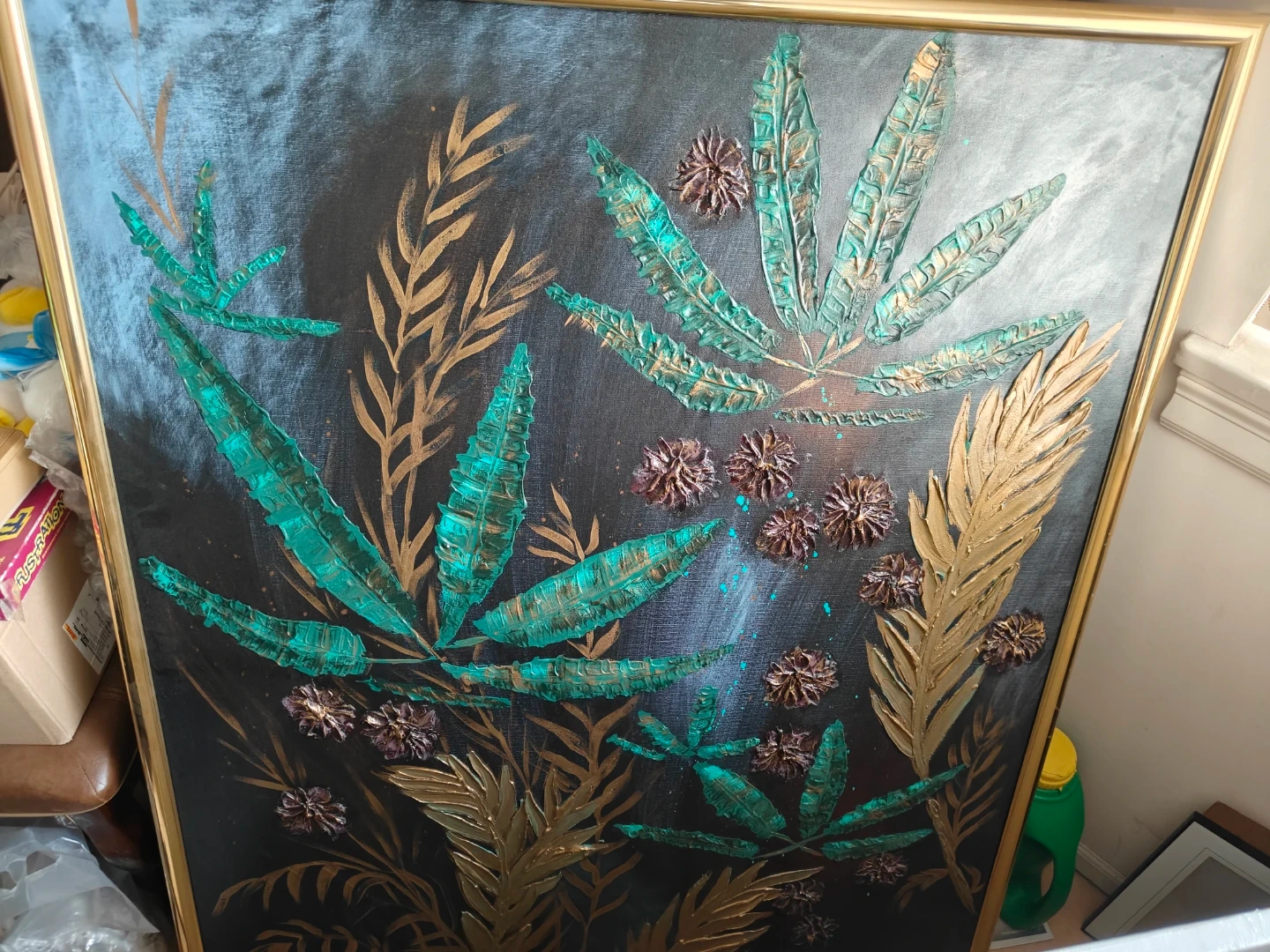 This framed wall art features a textured design with metallic gold and teal leaves against a dark background. It's a unique piece that adds a touch of nature-inspired decor to any room. The frame is gold-toned metal.