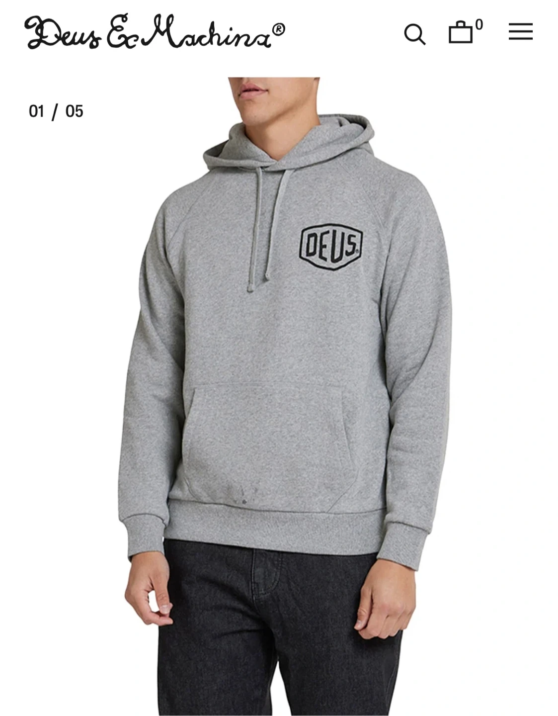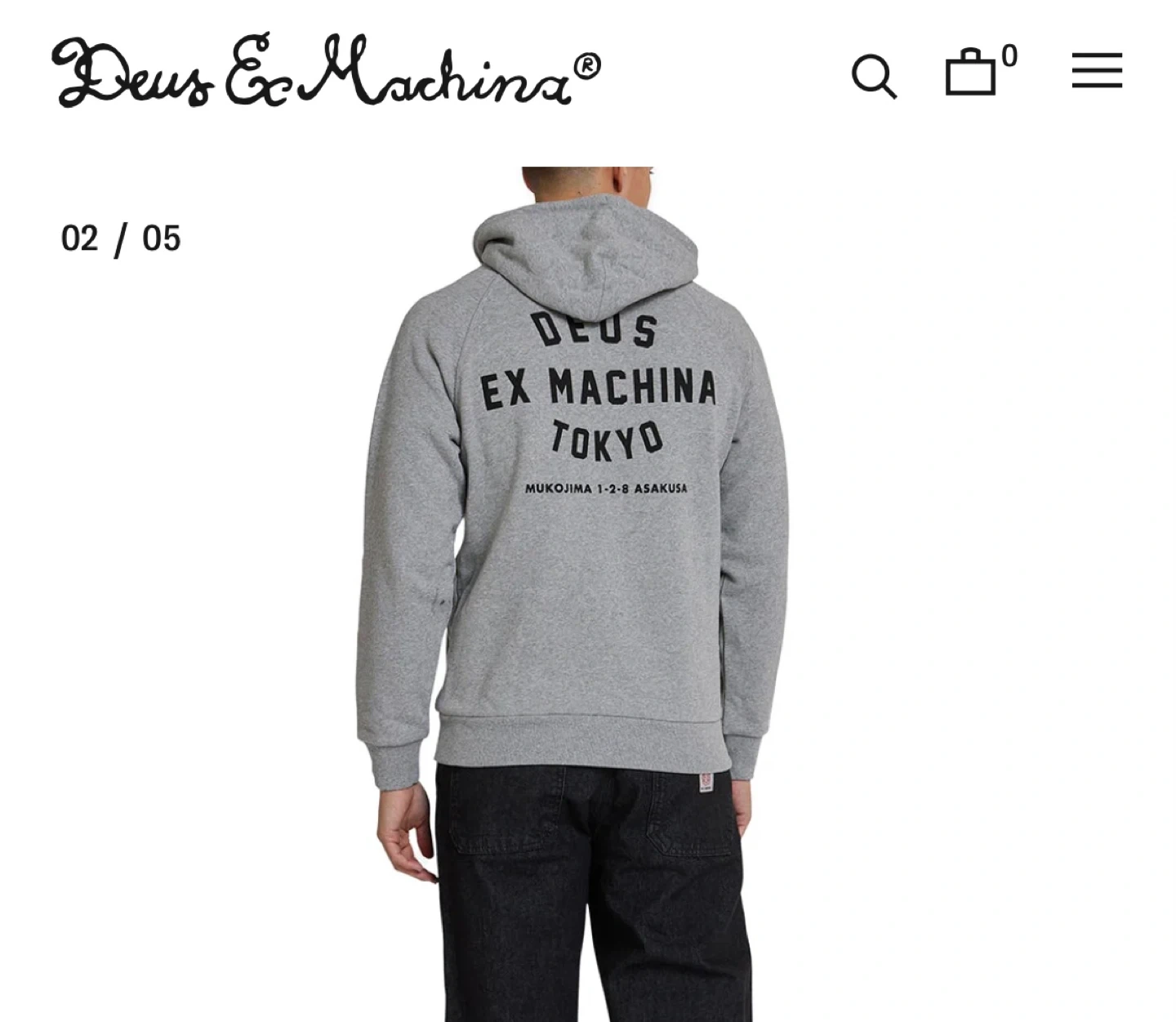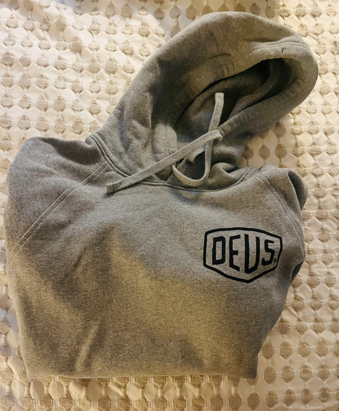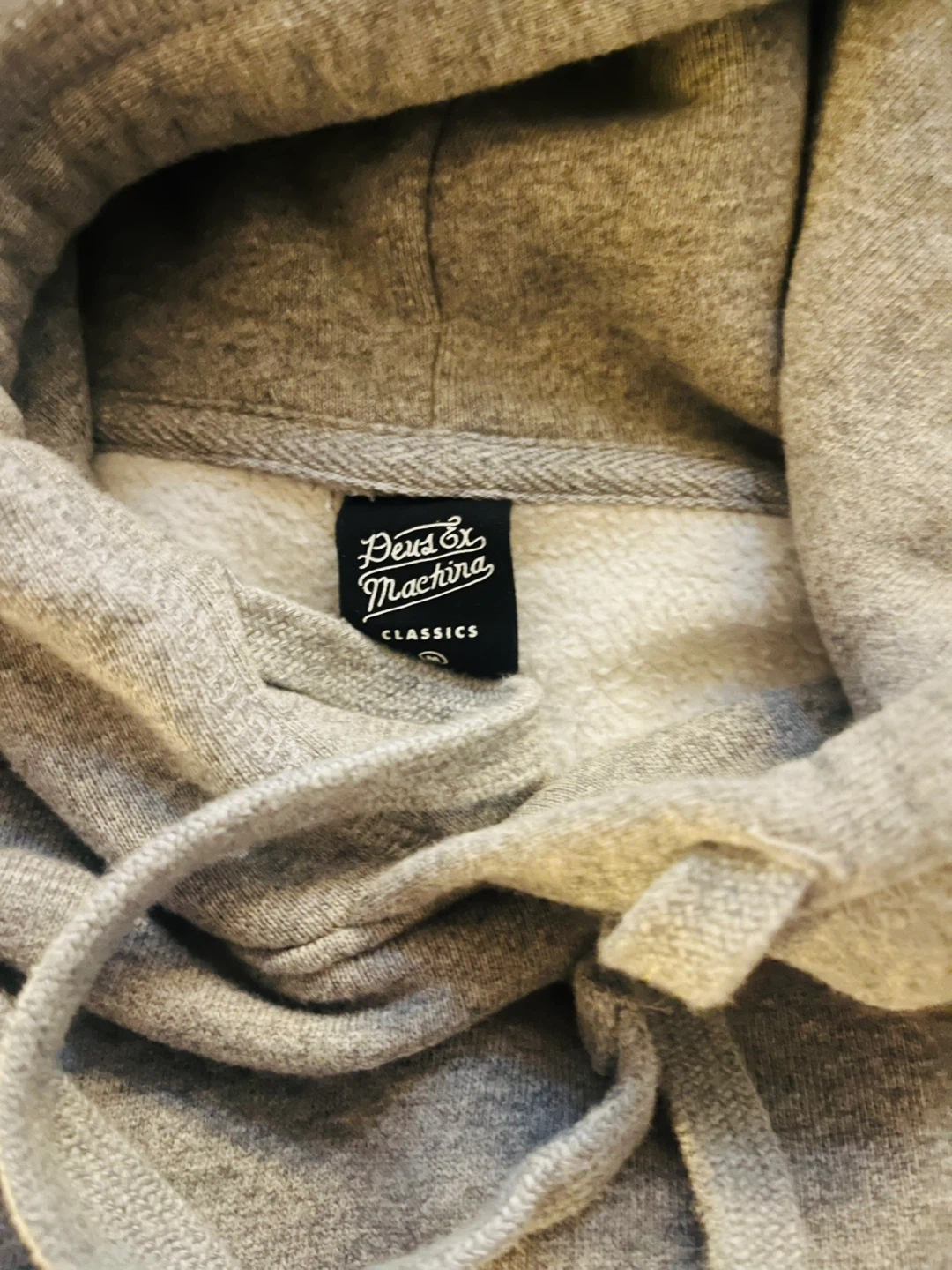Grey Deus Ex Machina hoodie with "Deus Ex Machina Tokyo" graphic on the back. Includes front pouch pocket and drawstring hood. Cotton blend material. Size M.