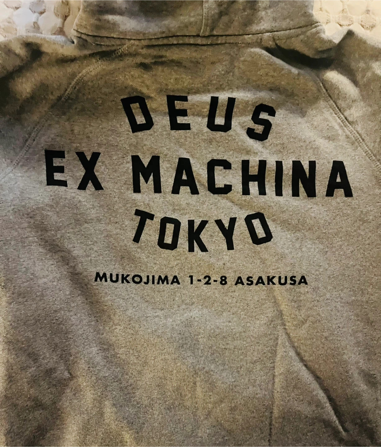 Grey Deus Ex Machina hoodie with "Deus Ex Machina Tokyo" graphic on the back. Includes front pouch pocket and drawstring hood. Cotton blend material. Size M.