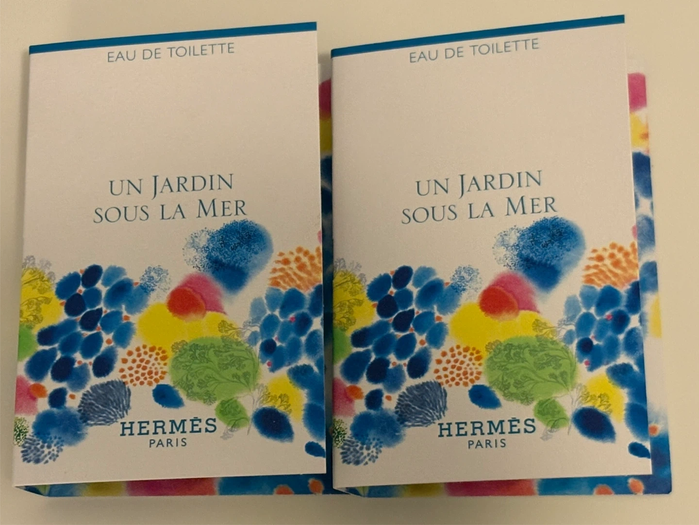 Two sample vials of Hermès Un Jardin Sous la Mer Eau de Toilette.