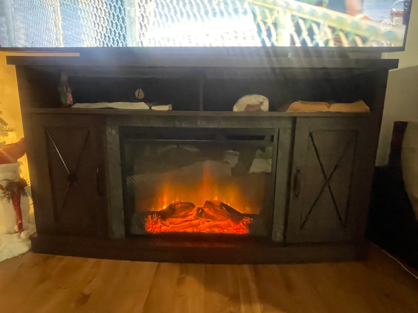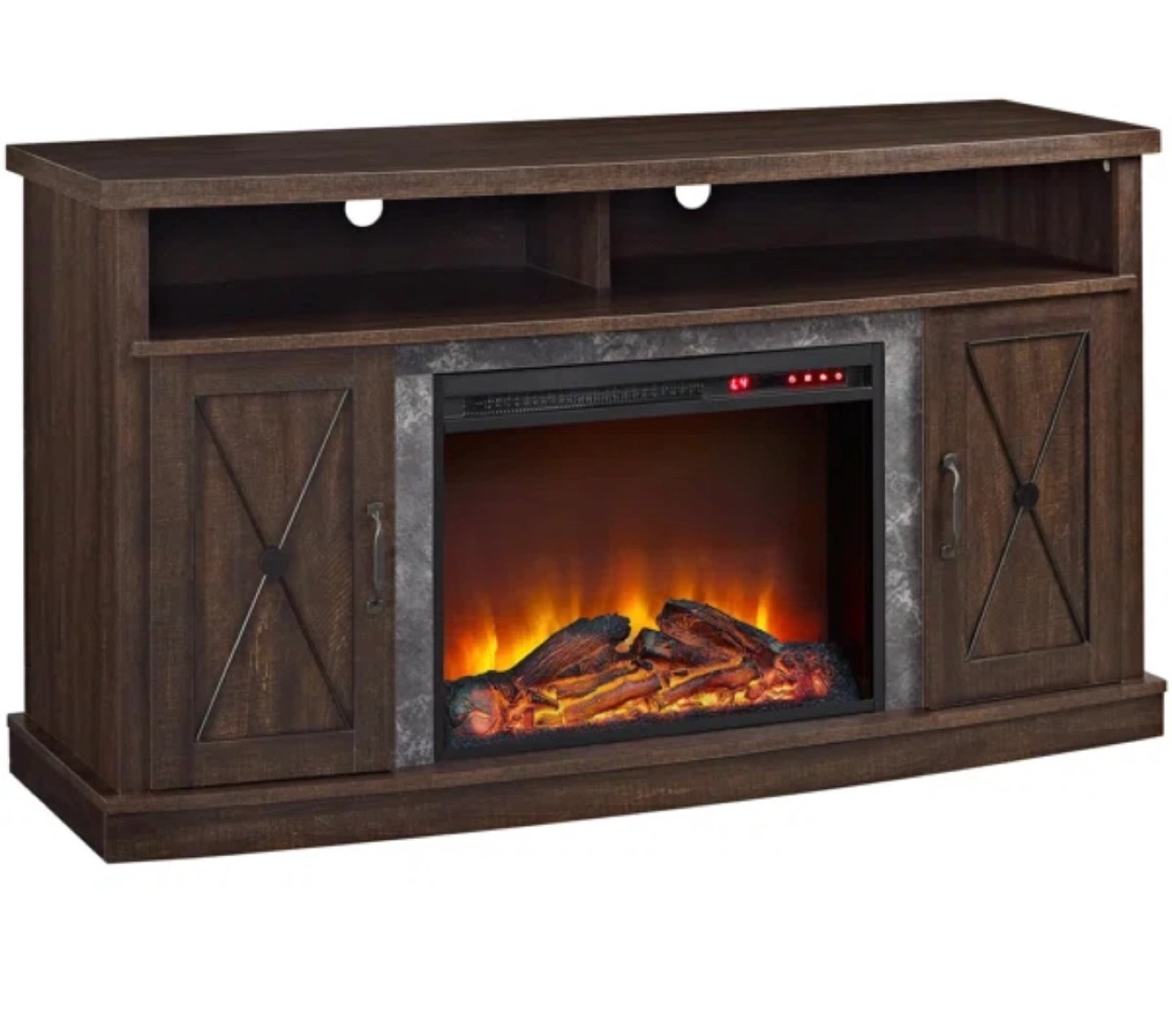 Selling a fireplace TV stand! It's in great condition and perfect for cozying up any living room. It has a rustic, farmhouse style with barn doors and a faux stone surround. It's great for TVs and provides extra storage space