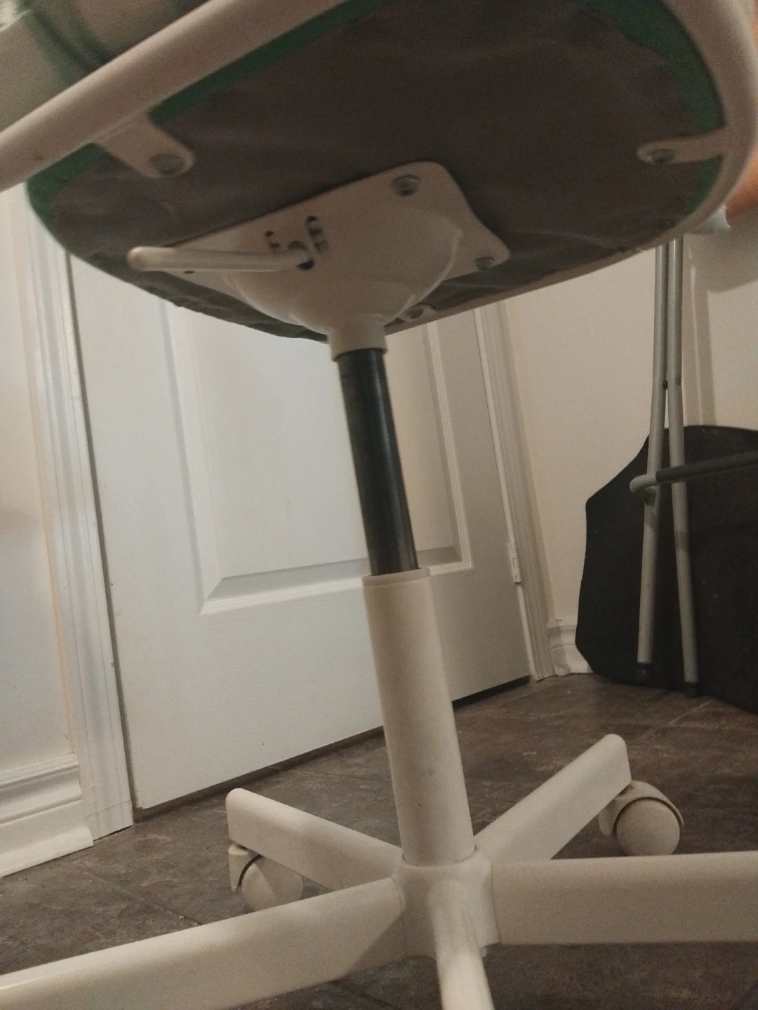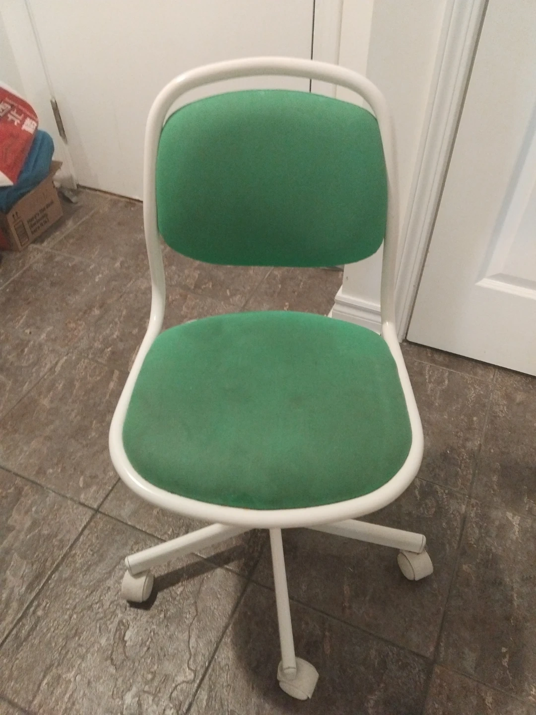 This is a green office chair with a white frame. It has a padded seat and back. A green and white checkered cushion is included, but it's not the cleanest with little stains on it. It's a comfortable chair for a desk!