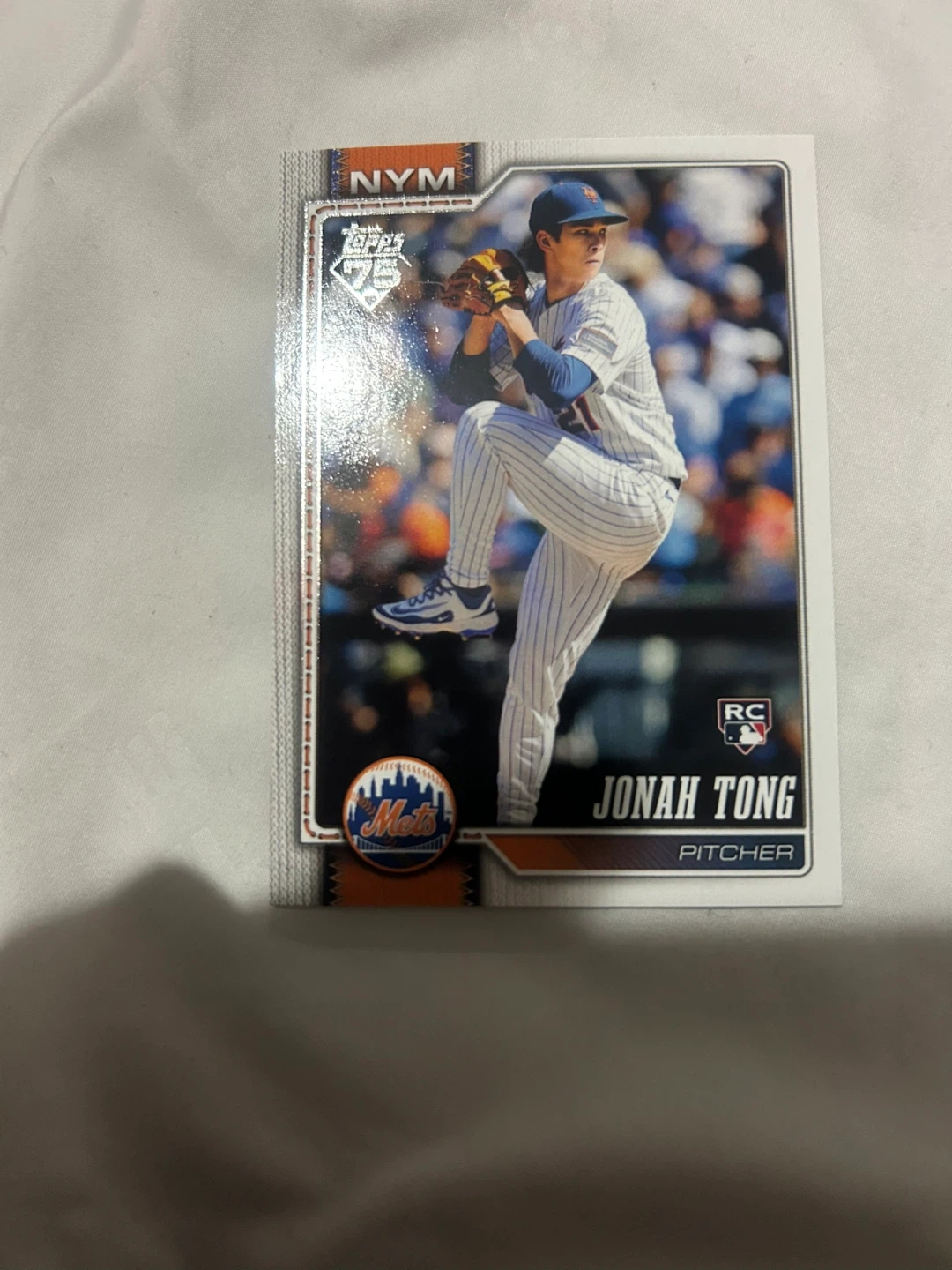 This is a 2023 Topps Chrome baseball card featuring Jonah Tong. It is a rookie card (RC) and shows him as a pitcher for the New York Mets. The card is in excellent condition and ready for your collection!