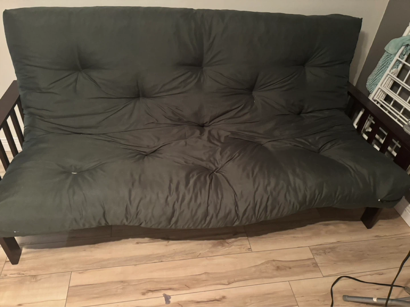 This futon features a comfortable dark grey tufted mattress and a sturdy dark wooden frame. It's perfect for small spaces or as an extra seating and sleeping option. The frame has a slatted design on the arms and back.