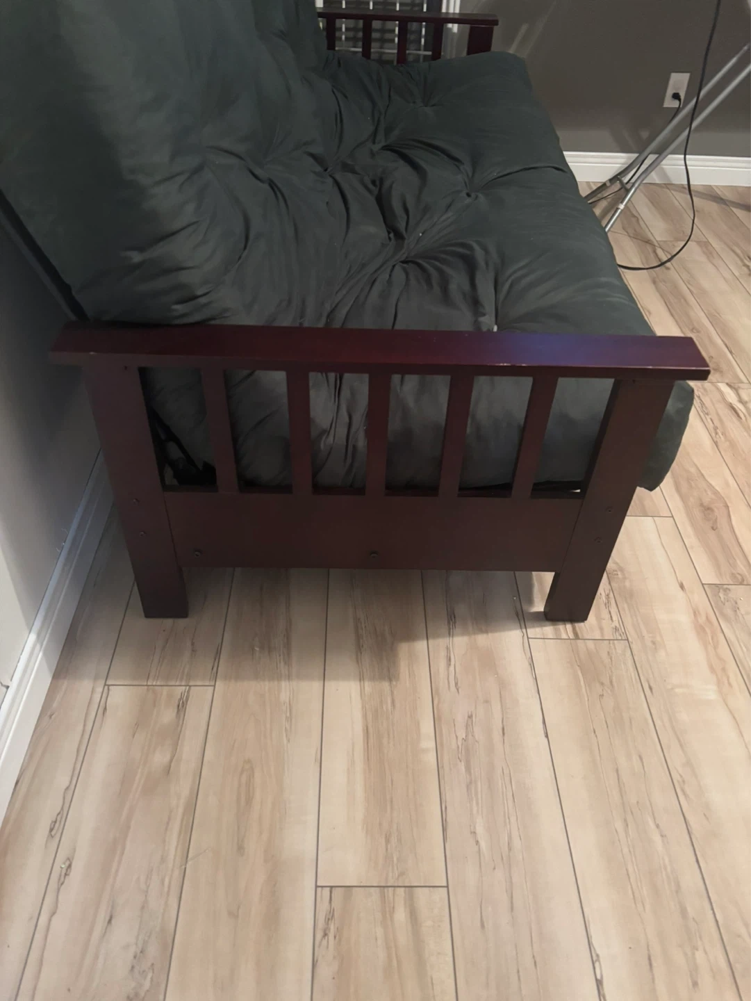 This futon features a comfortable dark grey tufted mattress and a sturdy dark wooden frame. It's perfect for small spaces or as an extra seating and sleeping option. The frame has a slatted design on the arms and back.