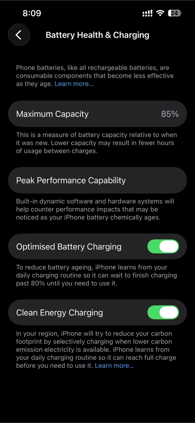 Apple iPhone 13 with 128GB storage in Midnight color. Battery health is at 85% maximum capacity. It's running on iOS.