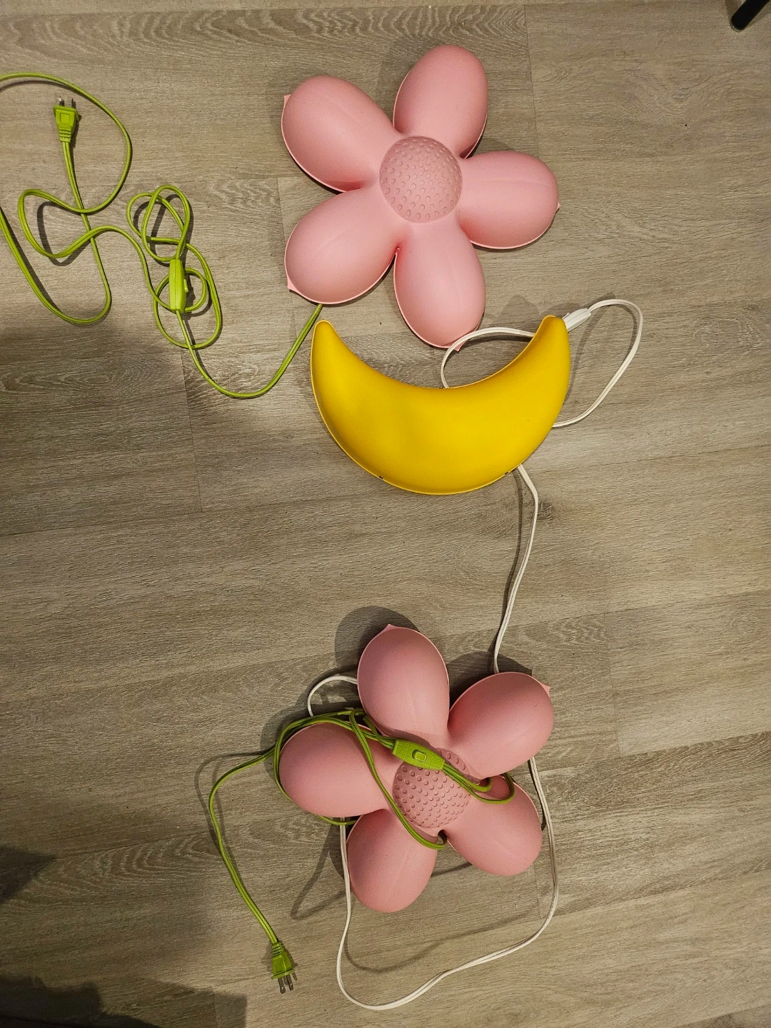 Set of two decorative night lights. Includes two pink flower-shaped lights and one yellow moon-shaped light. Perfect for a child's room!