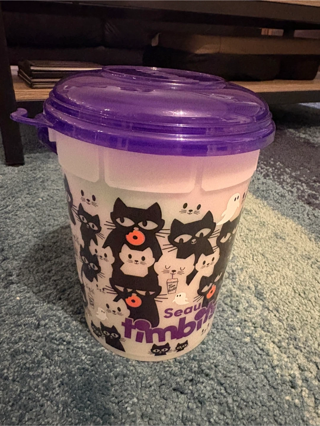 This Tim Hortons container features a fun Halloween cat design. It's made of translucent plastic with a purple lid. Perfect for collecting Halloween treats or for general storage!
