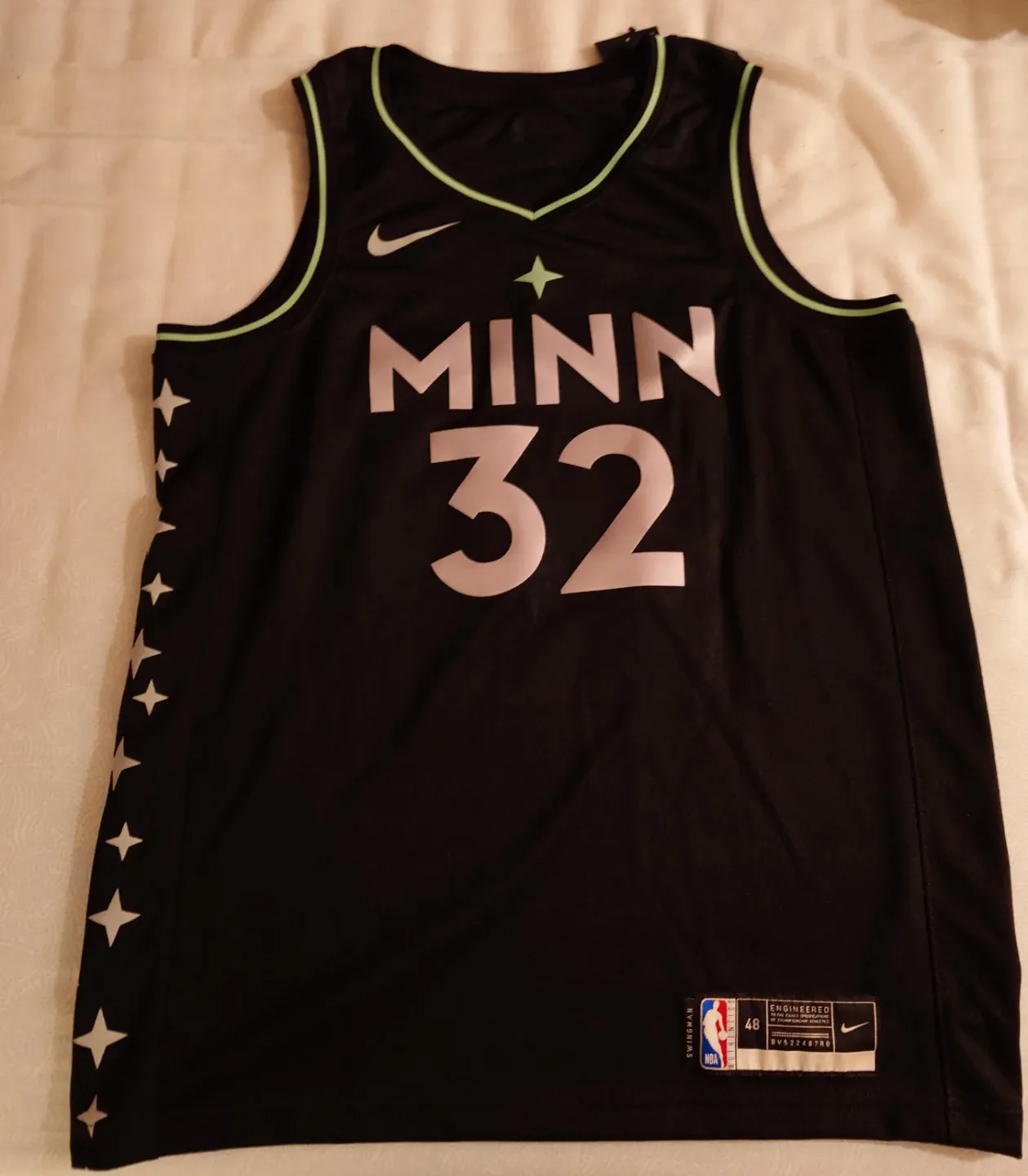 This is a Nike Minnesota Timberwolves basketball jersey with "MINN 32" on the front. It's a size 48. The jersey is black with green trim and features star details on the side. It's officially licensed by the NBA.