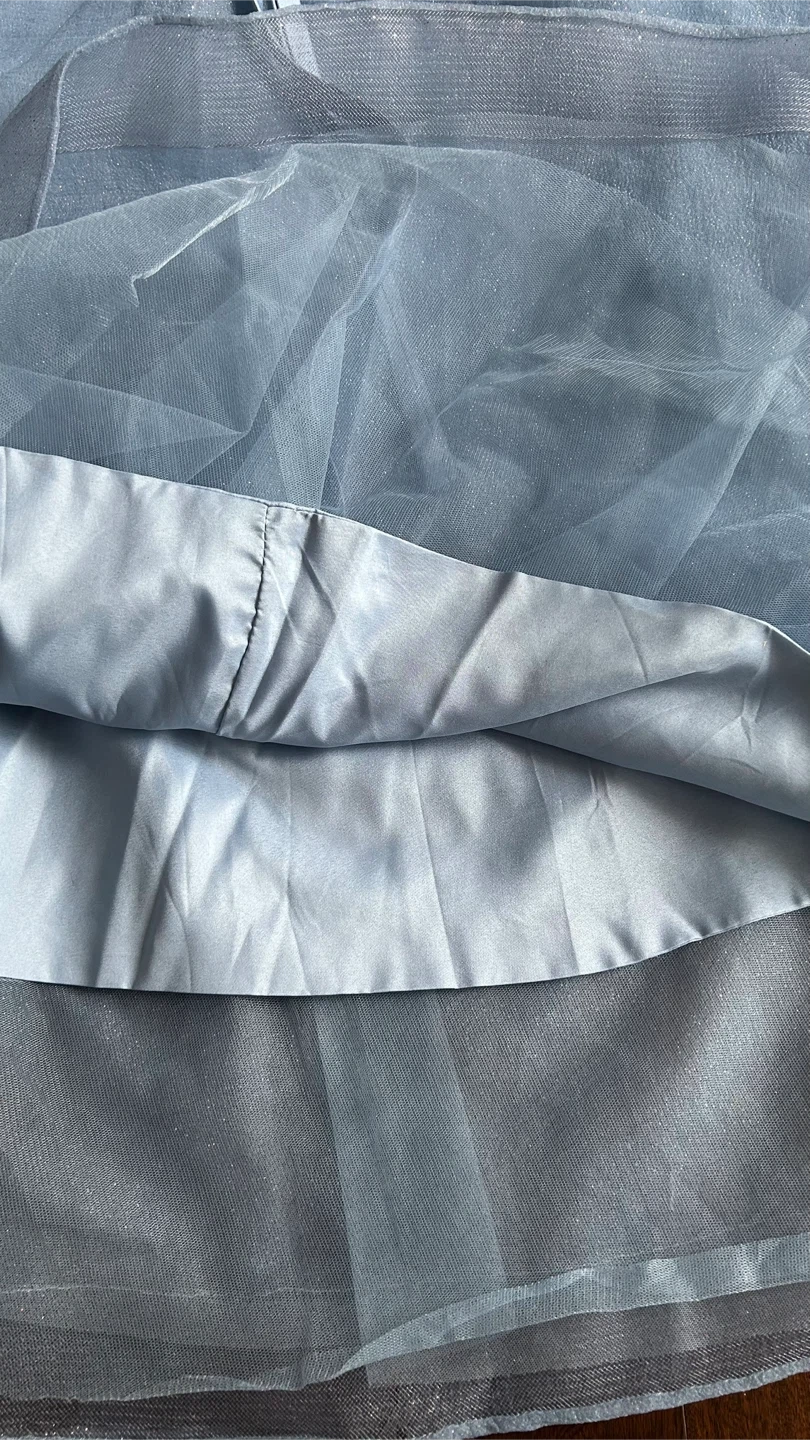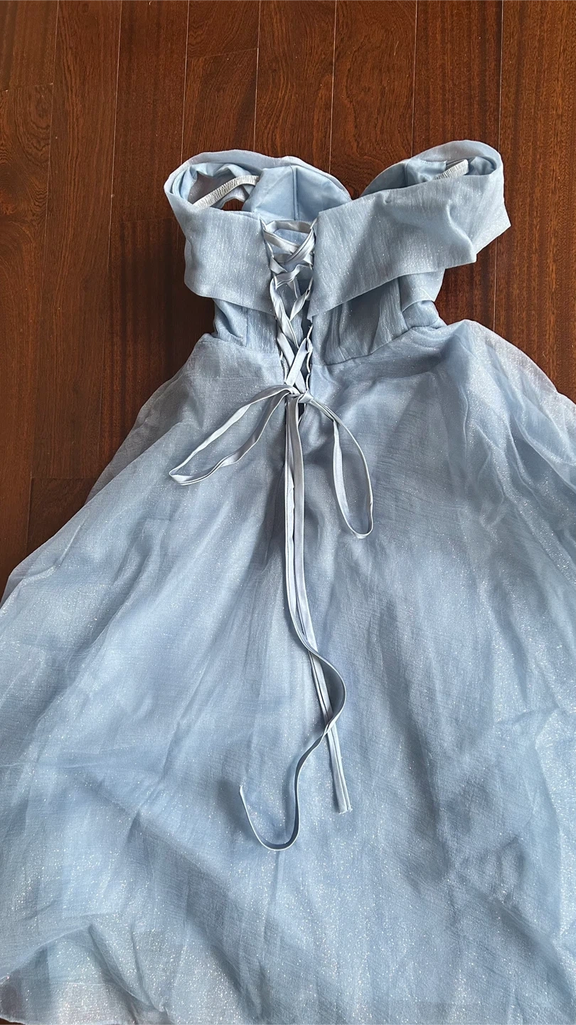Beautiful light blue off-the-shoulder gown with delicate beading on the bodice. It features a sparkly tulle overlay and a lace-up back for a custom fit. This dress is perfect for formal events!
