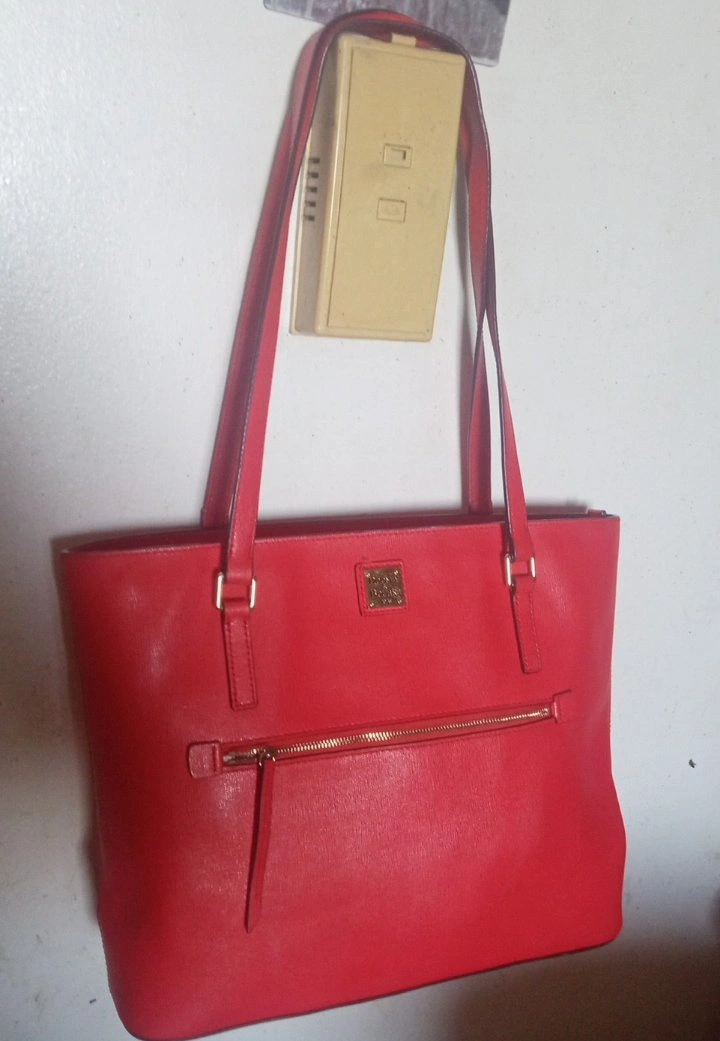 Large red tote bag. Top zipper closure. Two top handles. Gold-tone hardware. Great for everyday use.