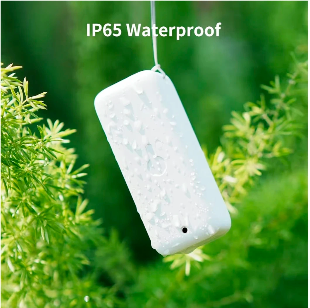 This SwitchBot Thermo-Hygrometer monitors indoor and outdoor environments. It's white and made of ABS material. The device supports temperature and humidity reporting, works with Amazon Alexa, and uses Bluetooth Low Energy for connectivity. It runs on 2 AAA batteries and has an approximate battery life of 2 years.