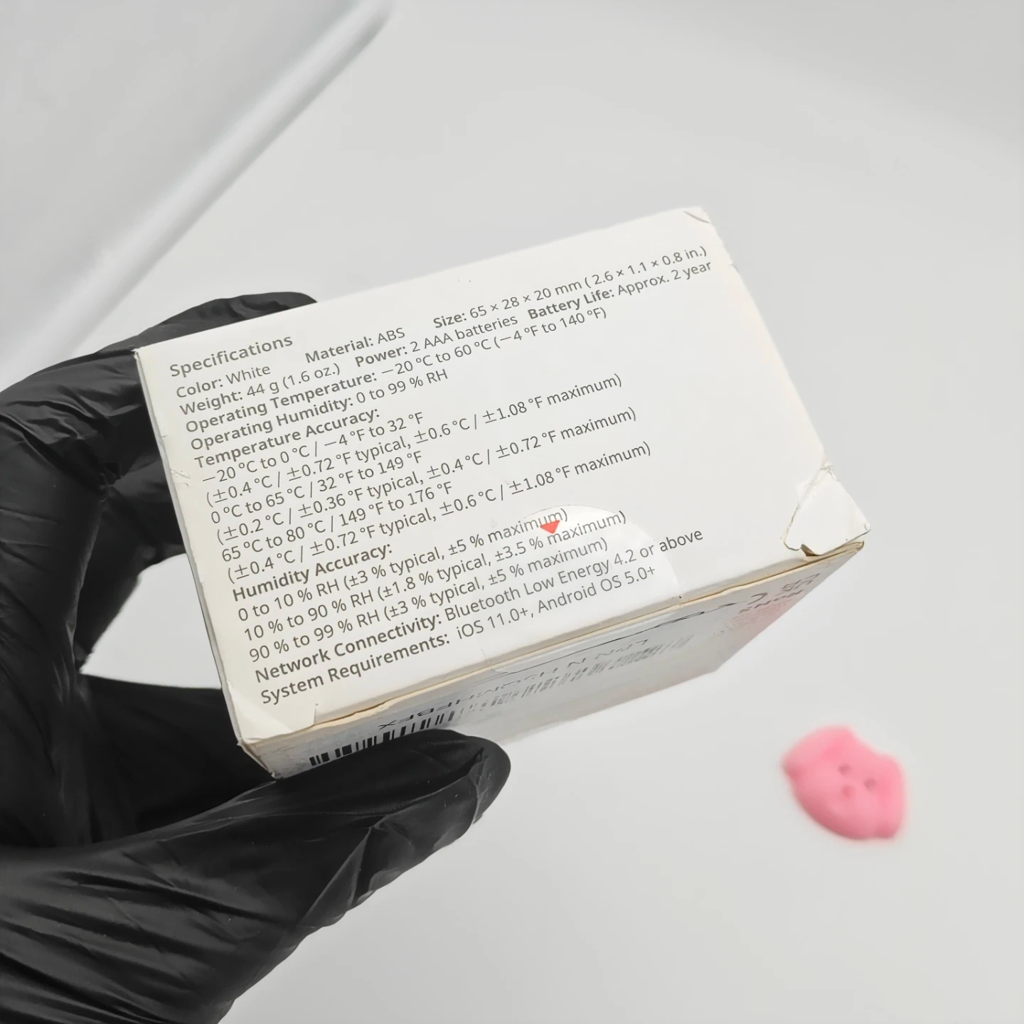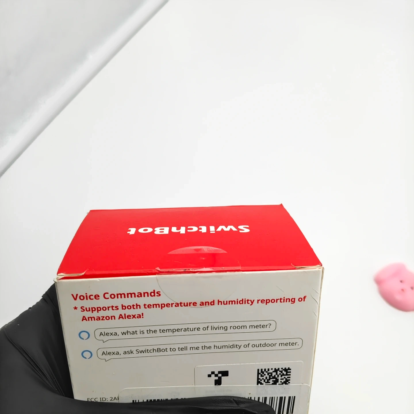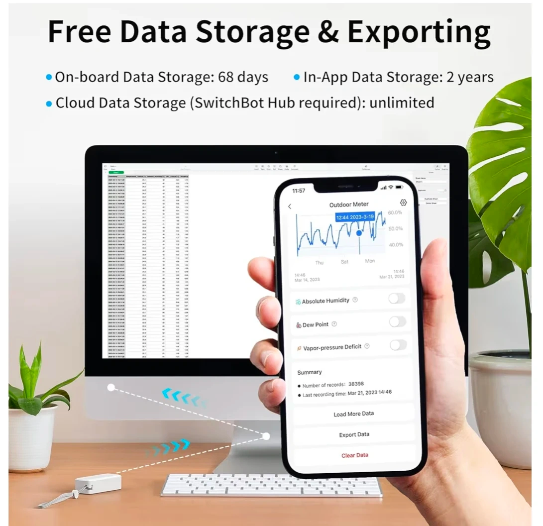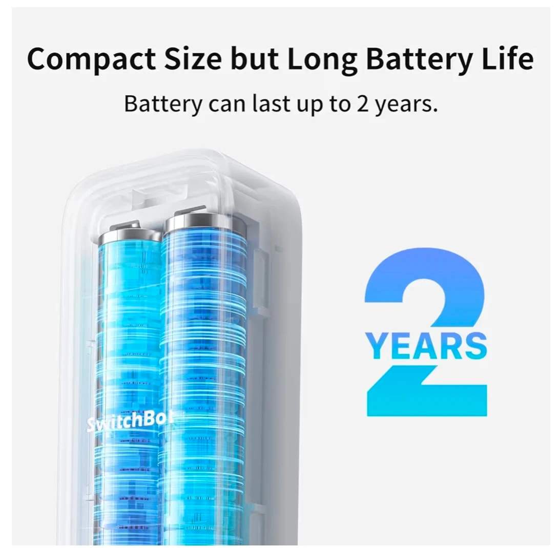 This SwitchBot Thermo-Hygrometer monitors indoor and outdoor environments. It's white and made of ABS material. The device supports temperature and humidity reporting, works with Amazon Alexa, and uses Bluetooth Low Energy for connectivity. It runs on 2 AAA batteries and has an approximate battery life of 2 years.
