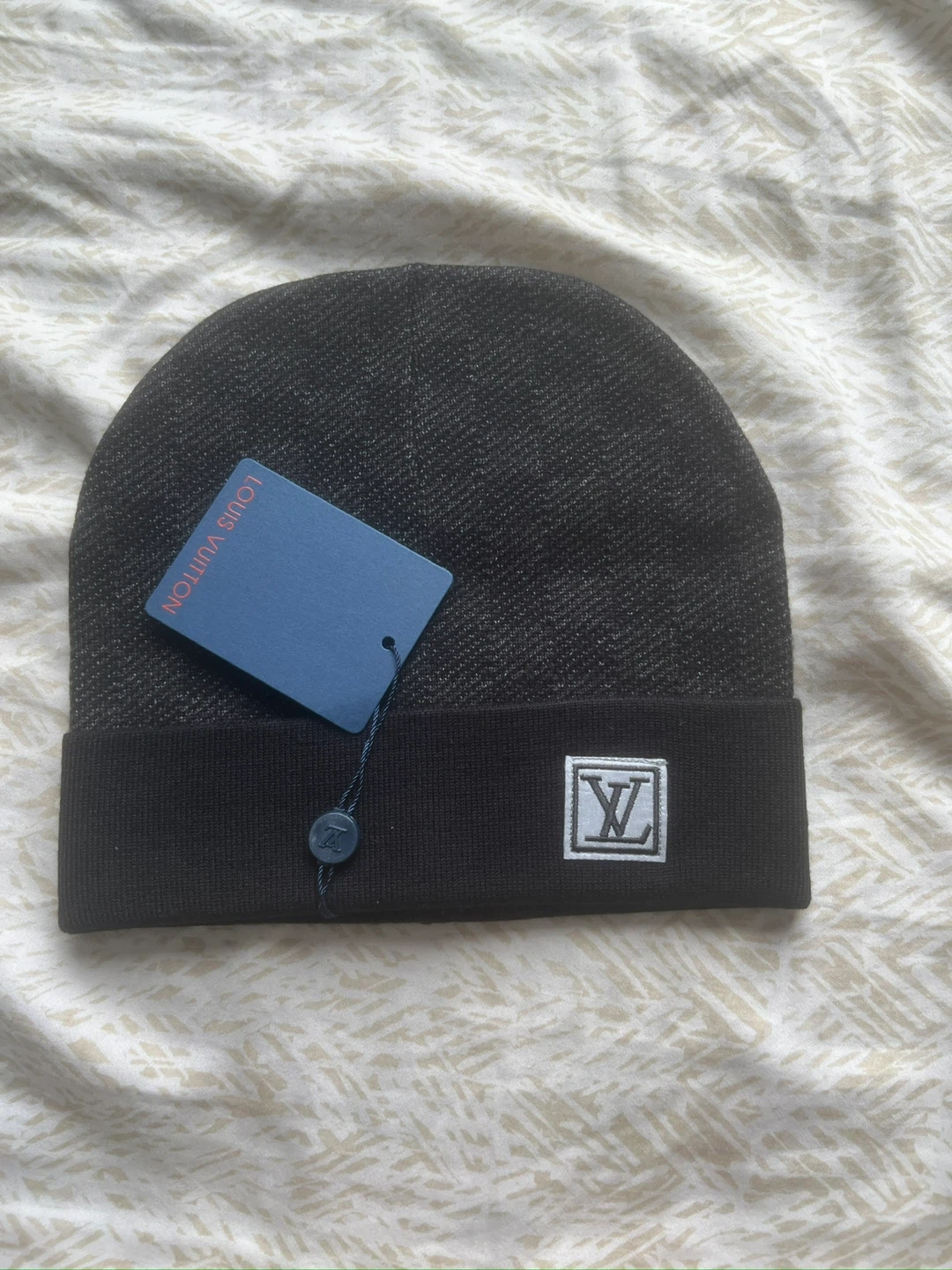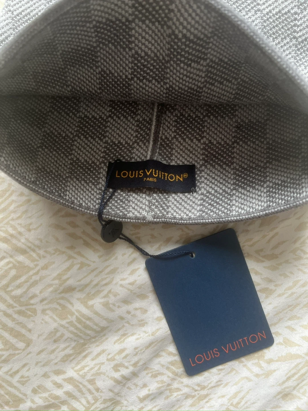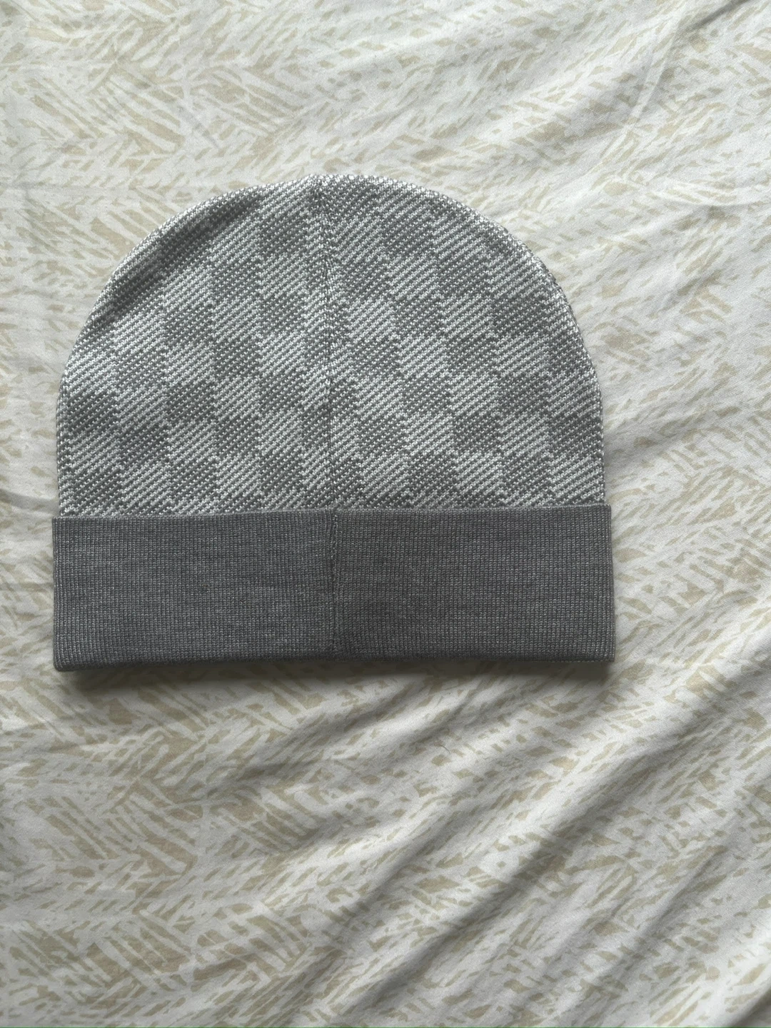 Selling a Louis Vuitton beanie in grey. It's in great condition and ready to keep you warm this winter. Features the classic LV logo and a stylish checkered pattern. Perfect for adding a touch of luxury to your everyday look!