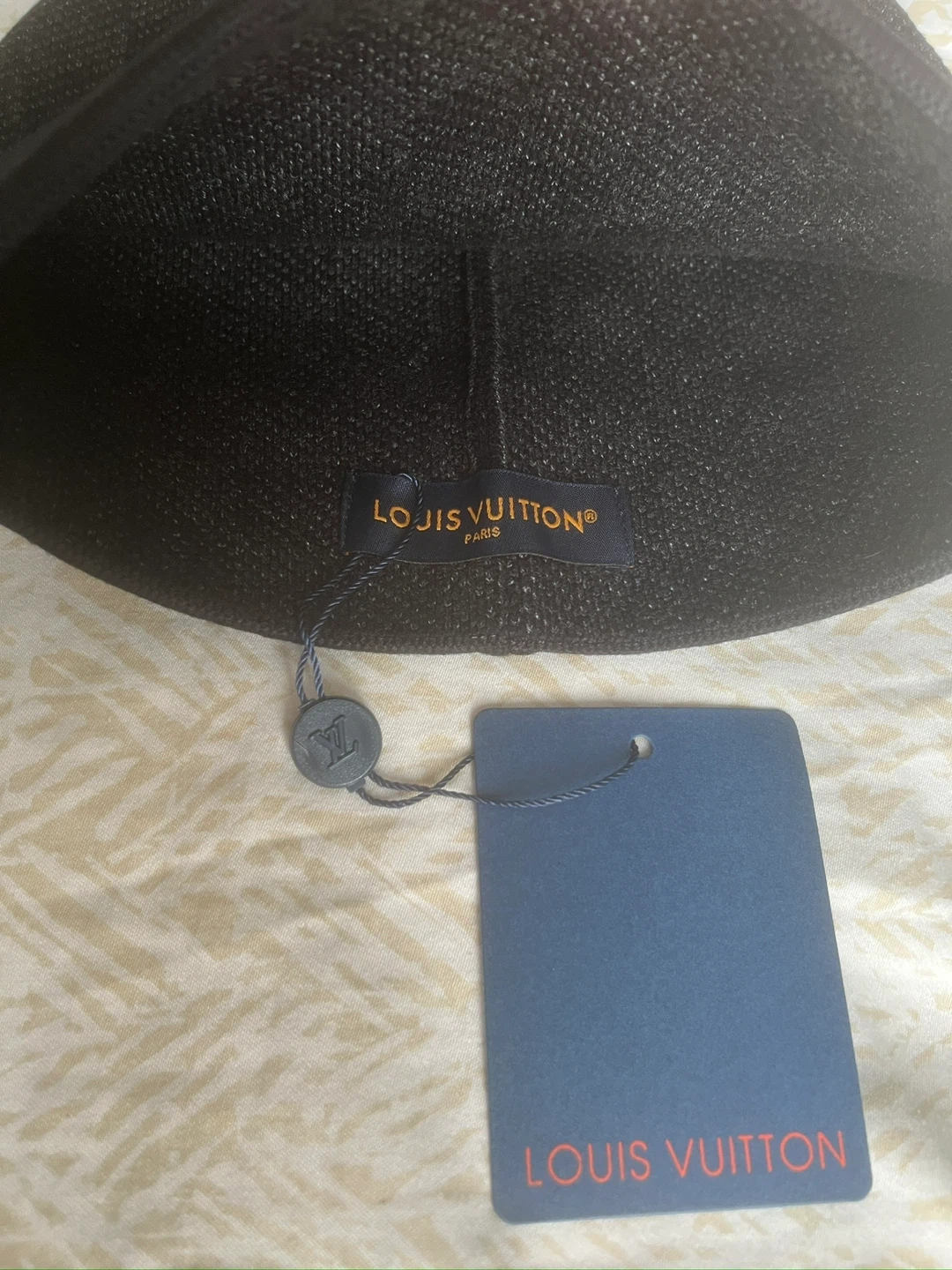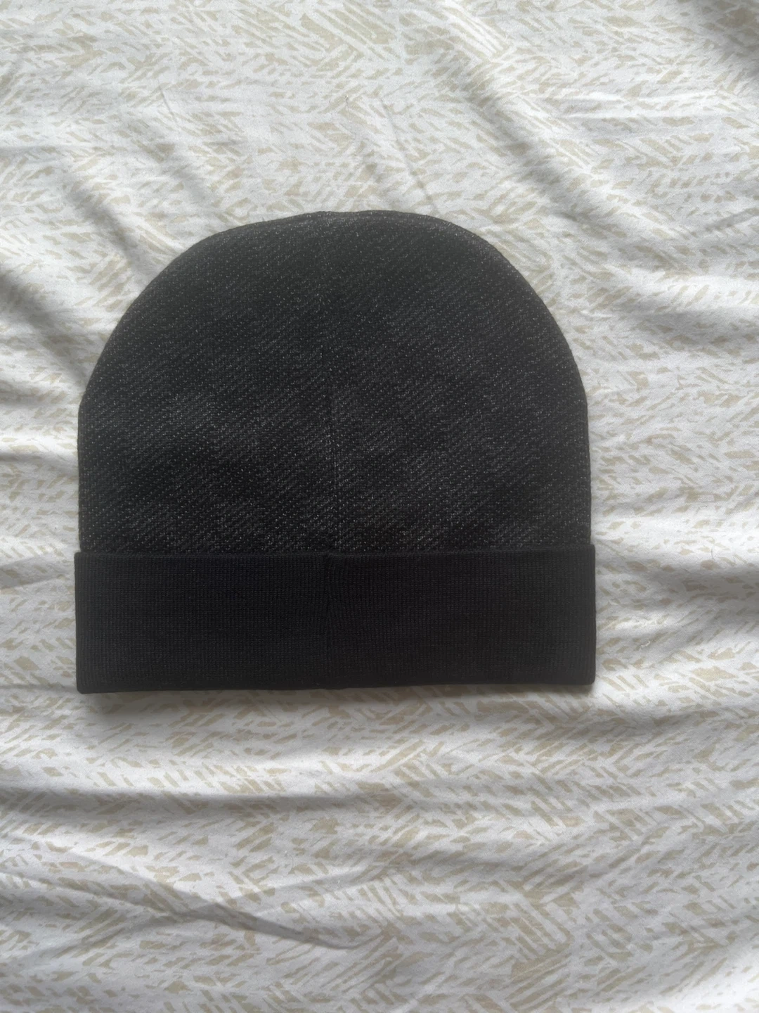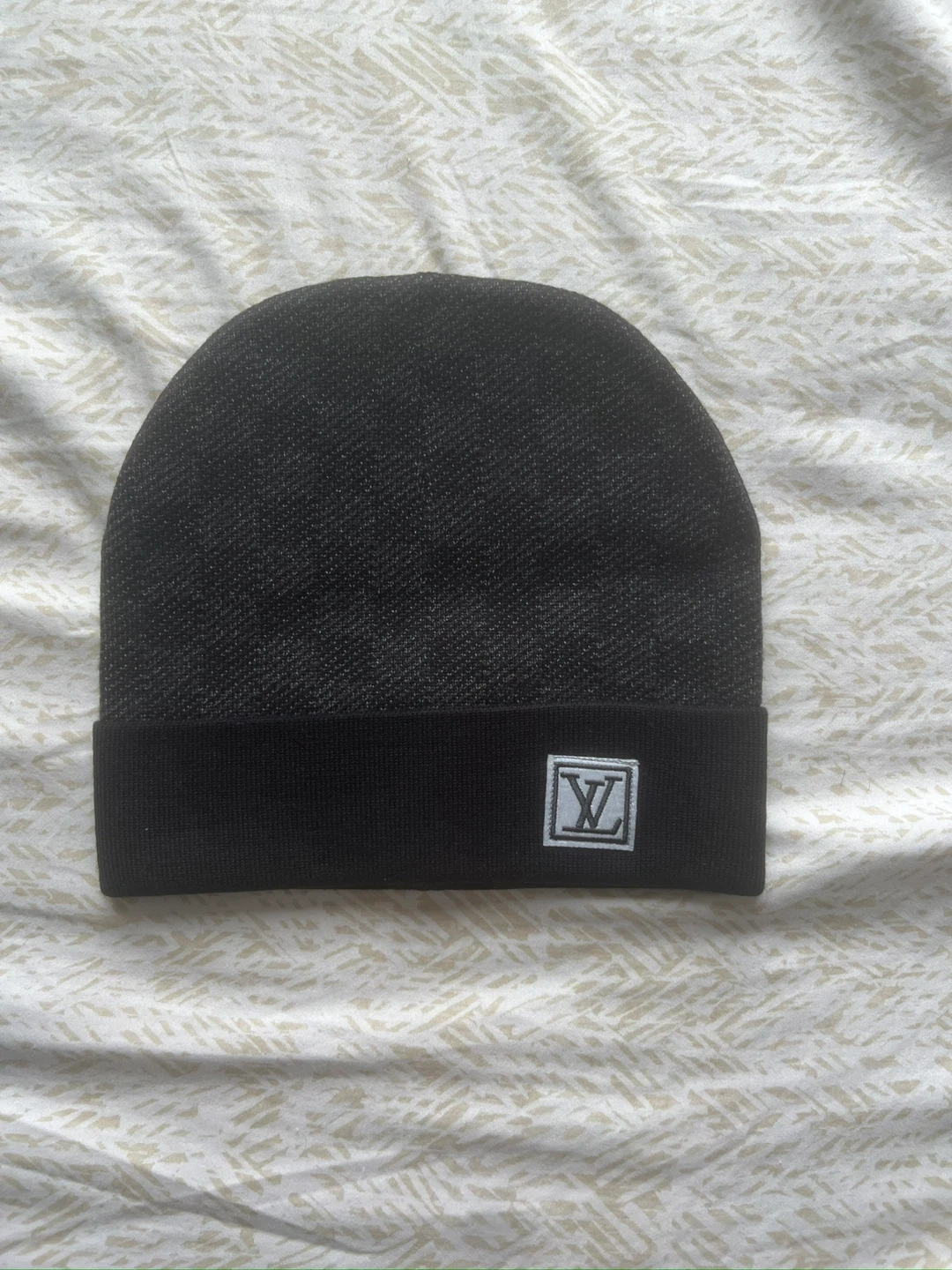 Selling a Louis Vuitton beanie in grey. It's in great condition and ready to keep you warm this winter. Features the classic LV logo and a stylish checkered pattern. Perfect for adding a touch of luxury to your everyday look!