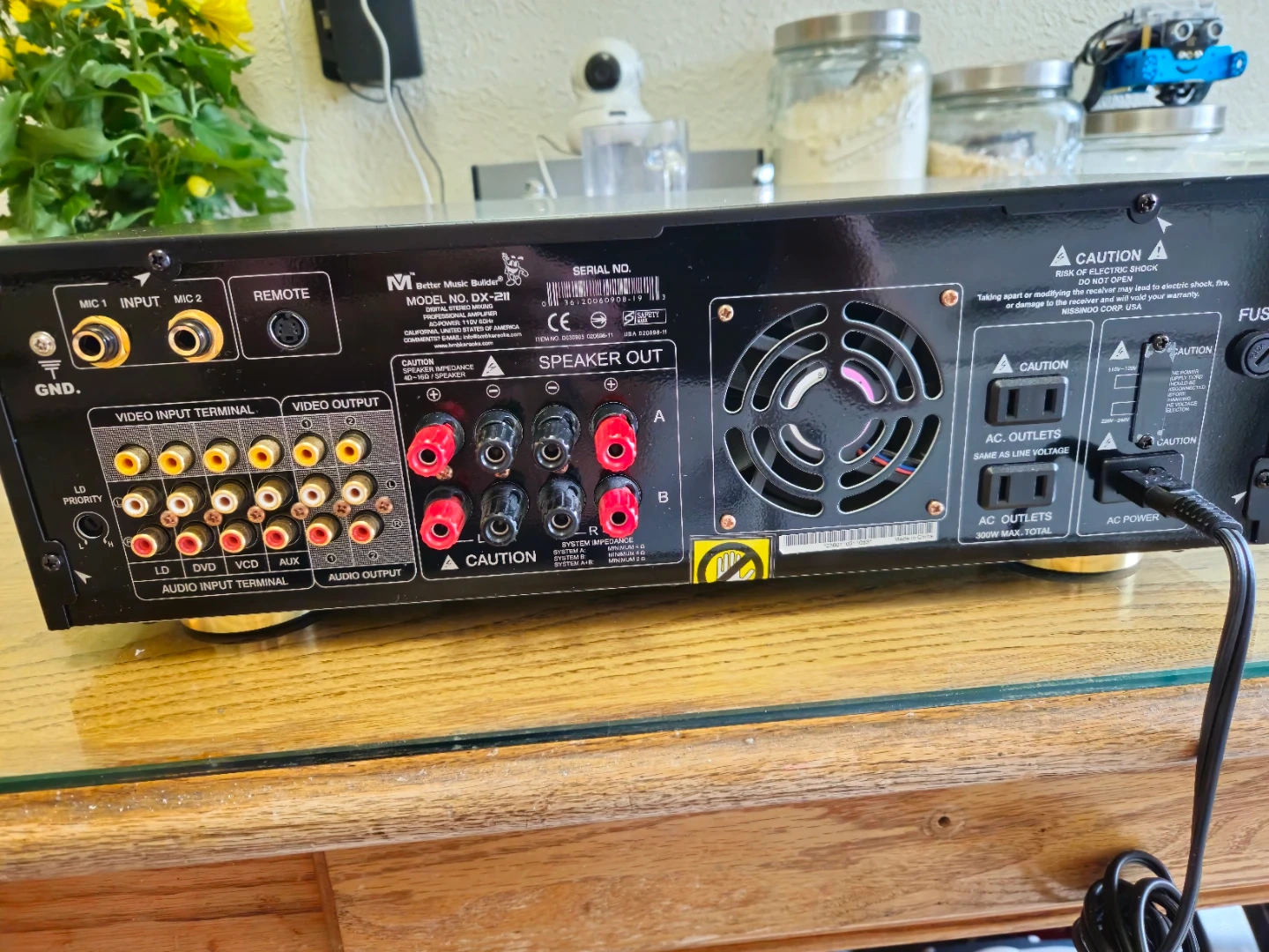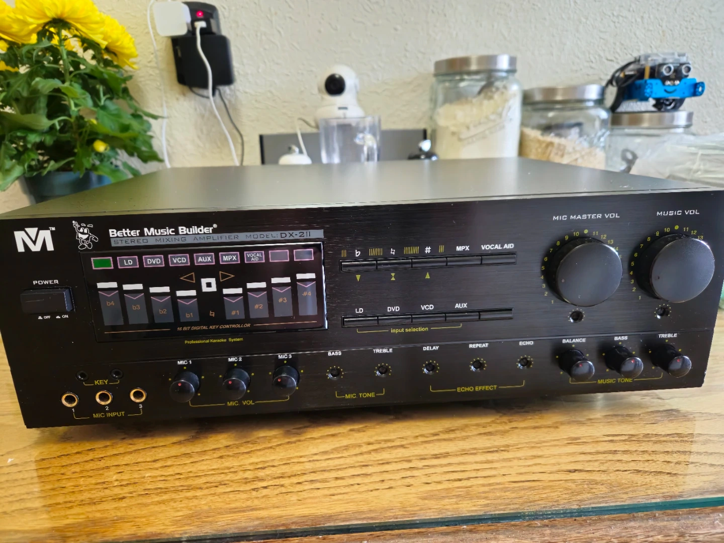 Better Music Builder DX-211 stereo mixing amplifier. Features digital key control and multiple mic inputs. Power input is 110V 60Hz.