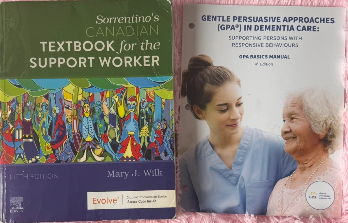This lot includes Sorrentino's Canadian Textbook for the Support Worker, Fifth Edition, by Mary J. Wilk. It also includes the Gentle Persuasive Approaches (GPA) in Dementia Care Basics Manual, 4th Edition. The textbook mentions student resources on Evolve with an access code inside.